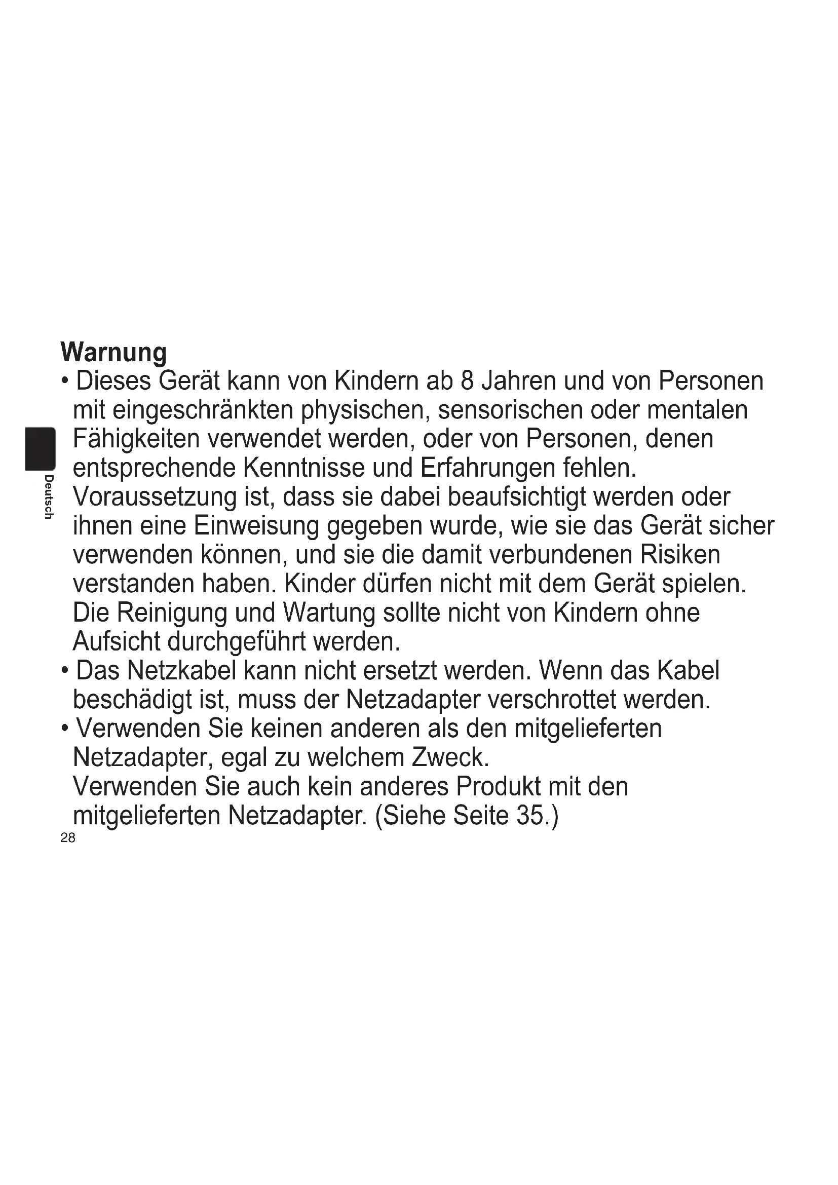 - Verwenden Sie keinen anderen als den mitgelieferten Netzadapter, egal zu welchem Zweck. Verwenden Sie auch kein anderes Produkt mit den mitgelieferten Netzadapter . (Siehe Seite 35.)29 Deutsch