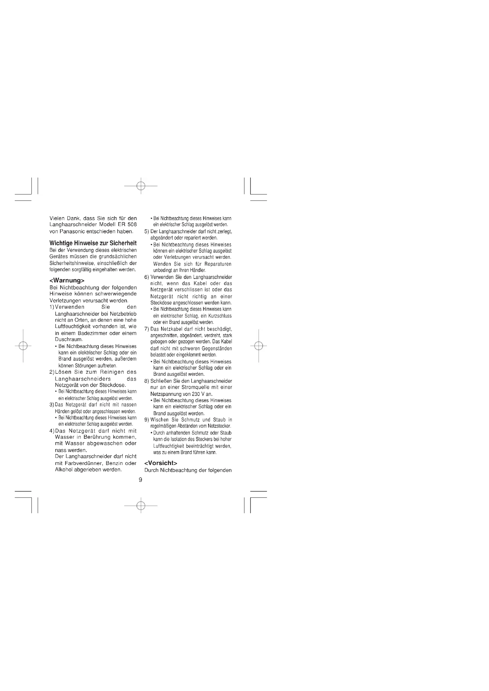 ()9 Vielen Dank, dass Sie sich für den Langhaarschneider Modell ER 508 von Panasonic entschieden haben. Wichtige Hinweise zur Sicherheit Bei der Verwendung dieses elektrischen Gerätes müssen die grundsächlichen Sicherheitshinweise, einschließlich der folgenden sorgfältig eingehalten werden. <Warnung> Bei Nichtbeachtung der folgenden Hinweise können schwerwiegende Verletzungen verursacht werden.