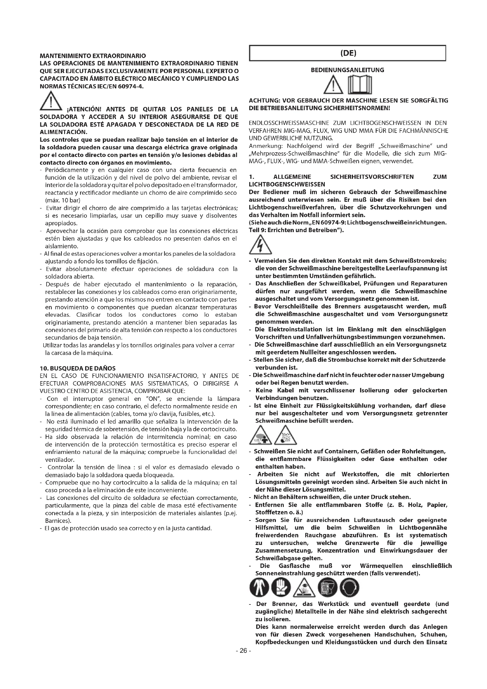ENTFERNT WERDEN, UM AUF IHR INNERES ZUZUGREIFEN, IST SICHERZUSTELLEN, DASS SIE ABGESCHALTET UND VOM VERSORGUNGSNETZ GETRENNT IST. Werden Kontrollen durchgeführt, während das Innere der Schweißmaschine unter Spannung steht, besteht die Gefahr eines schweren Stromschlages bei direktem Kontakt mit spannungsführenden Teilen oder von Verletzungen beim direkten Kontakt mit Bewegungselementen. - Regelmäßig und in der Häugkeit auf die Verwendungsweise und die Staubentwicklung am Arbeitsort abgestimmt, muß das Innere der Schweißmaschine inspiziert werden. Der Staub, der sich auf Transformator, Reaktanz und Gleichrichter abgelagert hat, ist mit trockener Druckluft abzublasen (max 10 bar). - Vermeiden Sie es, den Druckluftstrahl auf die elektronischen Karten zu richten. Sie sind mit einer besonders weichen Bürste oder geeigneten Lösungsmitteln bei Bedarf zu reinigen. - Wenn Gelegenheit besteht, prüfen Sie, ob die elektrischen Anschlüsse festsitzen und ob die Kabelisolierungen unversehrt sind. - Nach Beendigung dieser Arbeiten werden die Tafeln der Schweißmaschine wieder angebracht und die Feststellschrauben wieder vollständig angezogen. - Vermeiden Sie unter allen Umständen, bei geöneter Schweißmaschine zu arbeiten. - Nach Abschluss der Wartung oder Reparatur sind die Anschlüsse und Verkabelungen wieder in den ursprünglichen Zustand zu versetzen. Achten Sie darauf, dass diese nicht mit beweglichen Teilen oder solchen Teilen in Berührung kommen, die hohe Temperaturen erreichen können. Alle Leiter wieder wie zuvor bündeln, wobei darauf zu achten ist, dass die Hochspannungsanschlüsse des Primärtrafos von den Niederspannungsanschlüssen der Sekundärtrafos getrennt gehalten werden.- 32 - Verwenden Sie alle originalen Unterlegscheiben und Schrauben, um das Gehäuse wieder zu schließen.