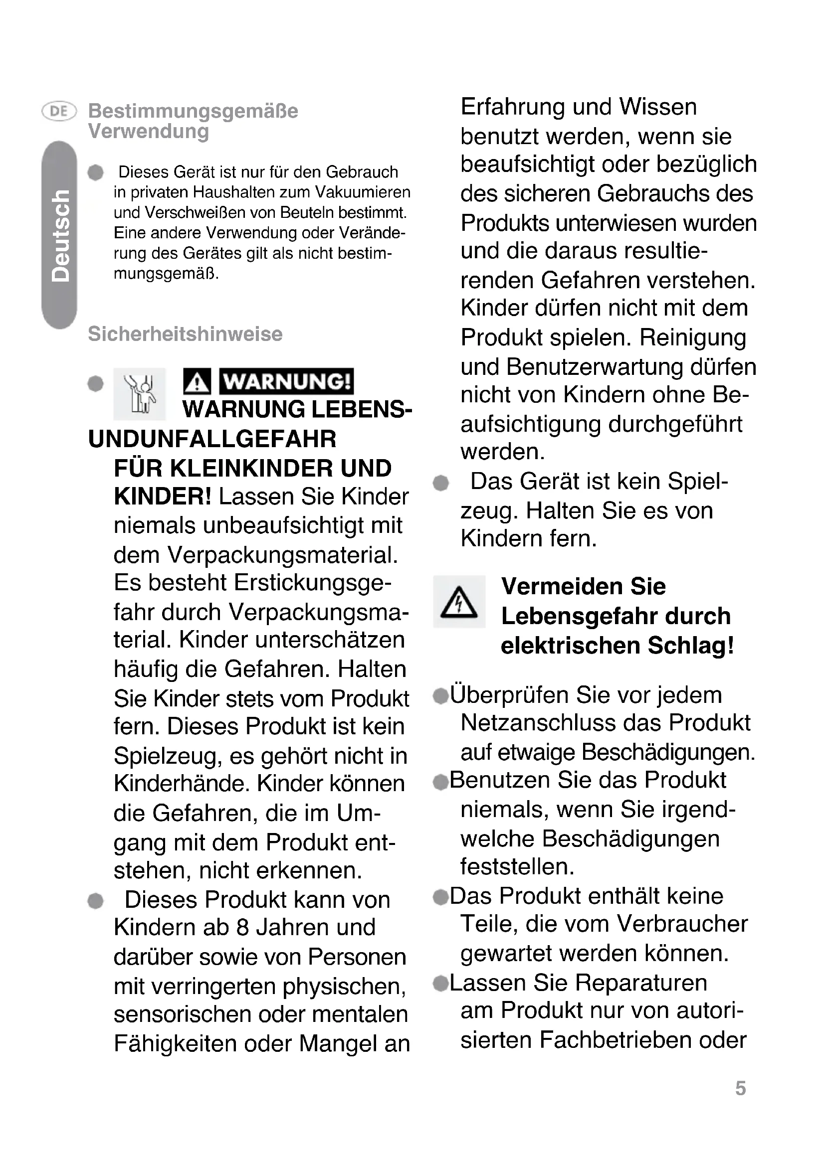 - Dieses Gerät ist nur für den Gebrauch in privaten Haushalten zum Vakuumieren und Verschweiben von Beuteln bestimmt. Eine andere Verwendung oder Veränderung des Gerätes gilt als nicht bestimmungsgemäß.