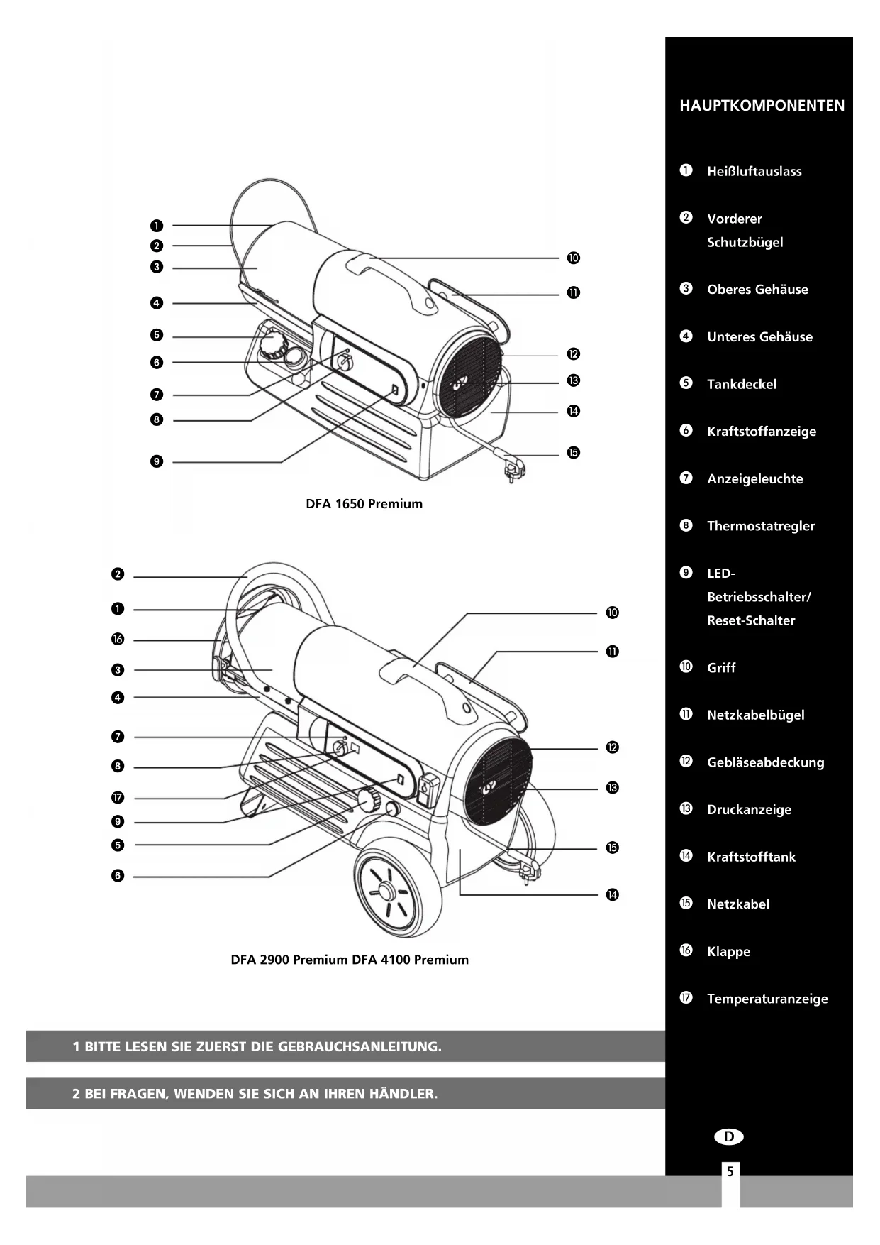 PVG Holding BV, Kanaalstraat 12 C, 5347 KM Oss, the Netherlands | P.O. Box 96, 5340 AB Oss, the Netherlands Qlima.com Made in Korea5 1 BITTE LESEN SIE ZUERST DIE GEBRAUCHSANLEITUNG. 2 BEI FRAGEN, WENDEN SIE SICH AN IHREN HÄNDLER. HAUPTKOMPONENTEN Heißluftauslass Vorderer Schutzbügel Oberes Gehäuse Unteres Gehäuse Tankdeckel Kraftstoffanzeige Anzeigeleuchte Thermostatregler LED- Betriebsschalter/ Reset-Schalter Griff Netzkabelbügel Gebläseabdeckung Druckanzeige Kraftstofftank Netzkabel Klappe Temperaturanzeige