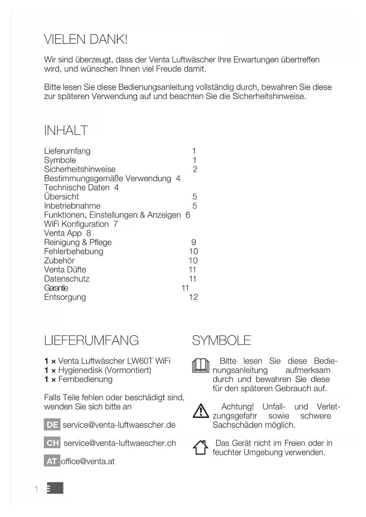 Die Venta Düfte wurden speziell für Venta Luftwäscher GmbH entwickelt und sind aus 100 % ätherischen Ölen und der Natur angelehnten Düften. Anwendungsbereich: Nur in vorgesehenen Dufthalter des Luftwäschers/Luftreini- gers (LW60T, LW60T WiFi, LW62 WiFi, LW62T WiFi, LP60, LP60 WiFi, LPH60 WiFi) einsetzen. Bitte Hinweise in der Bedienungsanleitung beachten. Aroma Kapsel nicht gewaltsam önen. Entsorgung: Verbrauchte Aroma Kapsel mit dem Haus- müll entsorgen. Haltbarkeit: nach dem Önen innerhalb von 20 Tagen aufbrauchen. Dosierung: Durch Drehen der Duftkappe kann die Intensität des Duftes reguliert werden. DATENSCHUTZ Ihre Daten werden durch Venta Luftwäscher GmbH vertraulich behandelt. Wenn sich Ihre persönlichen Daten ändern oder Sie Fragen zu unserem Umgang mit Ihren Daten haben, wenden Sie sich bitte an den Venta Kundendienst: DE 0751 5008 88, service@venta-luftwaescher.de AT 05572 202 539, oce@venta.at CH 041 781 15 15, service@venta-luftwaescher.ch Weitere Informationen zum Thema Datenschutz nden Sie in unseren Daten- schutzrichtlinien unter www.venta-luftwaescher.de, www.venta.at, www.venta-luftwaescher.ch GARANTIE Die Firma Venta-Luftwäscher GmbH leistet 2 Jahre Garantie auf schadhafte Teile und Arbeitslohn Ihres Luftwäschers. Der Geltungsbereich der Garantie liegt inner- halb der Europäischen Union. Für alle anderen Länder gilt der Geltungsbereich ausschließlich für das Land, in dem das Gerät erworben wurde. Als Garantienach- weis gilt ein gültiger Kaufbeleg.12DEVenta LW60T WiFi ENTSORGUNG Das Symbol "durchgestrichene Mülltonne" erfordert die separate Ent- sorgung von Elektro- und Elektronik-Altgeräten (WEEE) sowie verbrauchten Batterien. Solche Geräte können gefährliche und umweltgefährdende Stoe enthalten. Diese Produkte sind an einer ausgewiesenen Sammelstelle für das Recycling von elektrischen und elektronischen Geräten zu entsorgen und dür- fen nicht im unsortierten Hausmüll entsorgt werden. Verbrauchte Batterien gehören nicht in den Hausmüll. Geben Sie diese bei entsprechenden Sammelstellen oder im Handel ab. Dadurch tragen Sie zum Schutz der Ressourcen und der Umwelt bei. Für weitere Informationen wenden Sie sich bitte an die örtlichen Behörden. Kinder dürfen auf keinen Fall mit Kunststobeuteln und Verpackungsmaterial spie- len, da Verletzungs- bzw. Erstickungsgefahr besteht. Solches Material sicher la- gern oder auf umweltfreundliche Weise entsorgen.13 EN THANK YOU! We are convinced that the Venta Airwasher will exceed your expectations and we hope you enjoy our product. Please read these operating instructions completely, keep them for later use, and follow the safety instructions. SYMBOLS Please read these operating in- structions carefully and keep them for later use. Attention! Danger of accident and injury as well as property damage possible. Do not use the appliance out- doors or in damp locations.