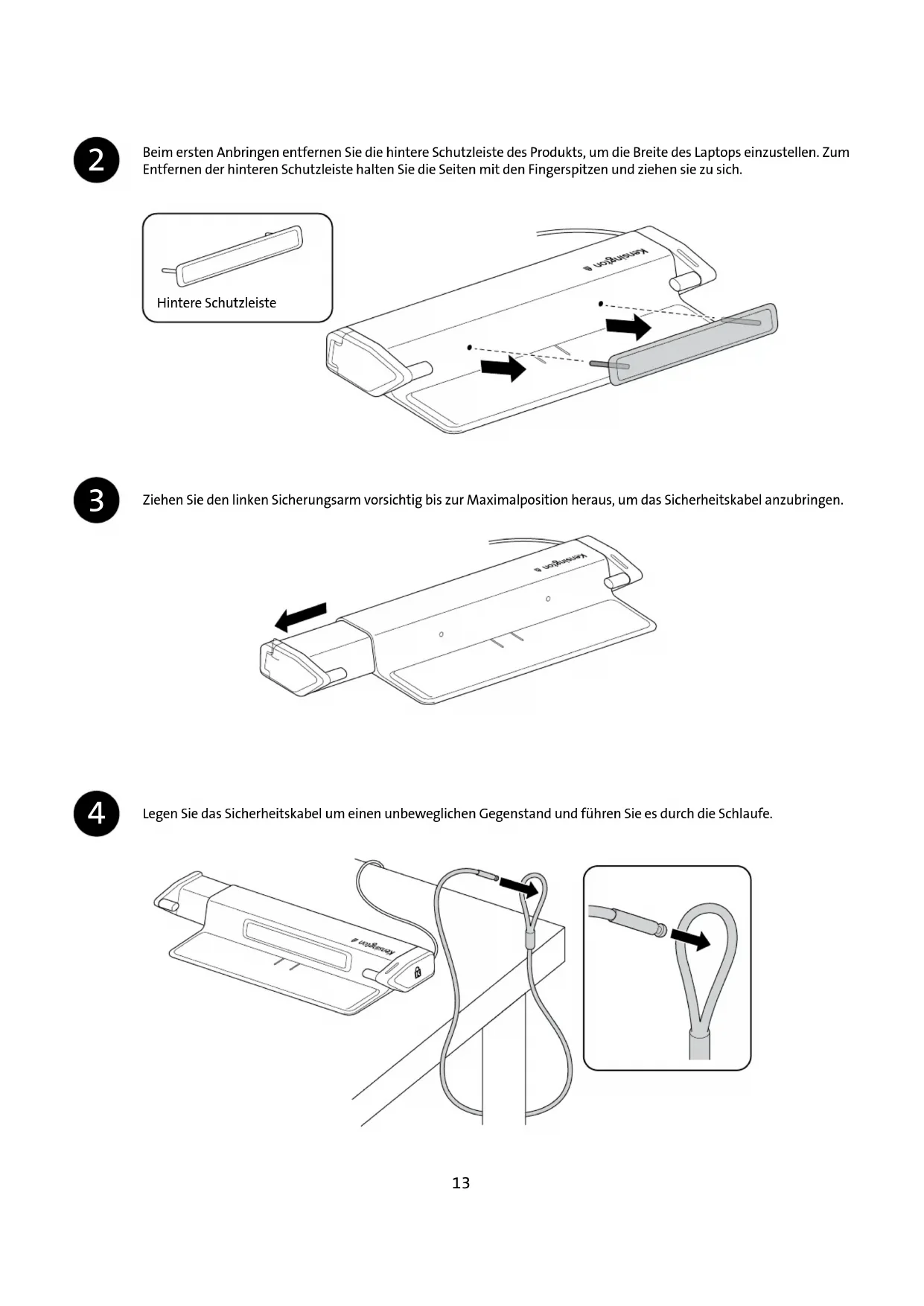 Ziehen Sie den linken Sicherungssarm vorsichtig bis zur Maximalposition hereus, um das Sicherheitskabel anzubringen.