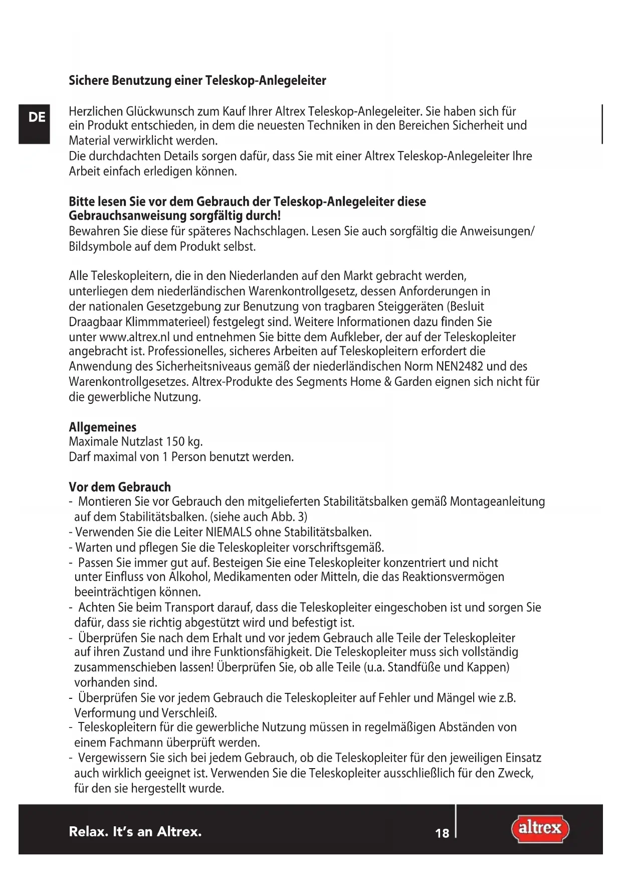 Sichere Benutzung einer Teleskop-Anlegeleiter Herzlichen Glückwunsch zum Kauf Ihrer Altrex Teleskop-Anlegeleiter. Sie haben sich für ein Produkt entschieden, in dem die neuesten Techniken in den Bereichen Sicherheit und Material verwirklicht werden. Die durchdachten Details sorgen dafür, dass Sie mit einer Altrex Teleskop-Anlegeleiter Ihre Arbeit einfach erledigen können. Bitte lesen Sie vor dem Gebrauch der Teleskop-Anlegeleiter diese Gebrauchsanweisung sorgfältig durch! Bewahren Sie diese für späteres Nachschlagen. Lesen Sie auch sorgfältig die Anweisungen/ Bildsymbole auf dem Produkt selbst. Alle Teleskopleitern, die in den Niederlanden auf den Markt gebracht werden, unterliegen dem niederländischen Warenkontrollgesetz, dessen Anforderungen in der nationalen Gesetzgebung zur Benutzung von tragbaren Steiggeräten (Besluit Draagbaar Klimmmaterieel) festgelegt sind. Weitere Informationen dazu finden Sie unter www.altrex.nl und entnehmen Sie bitte dem Aufkleber, der auf der Teleskopleiter angebracht ist. Professionelles, sicheres Arbeiten auf Teleskopleitern erfordert die Anwendung des Sicherheitsniveaus gemäß der niederländischen Norm NEN2482 und des Warenkontrollgesetzes. Altrex-Produkte des Segments Home & Garden eignen sich nicht für die gewerbliche Nutzung. Allgemeines Maximale Nutzlast 150 kg. Darf maximal von 1 Person benutzt werden. Vor dem Gebrauch - Montieren Sie vor Gebrauch den mitgelieferten Stabilitätsbalken gemäß Montageanleitung auf dem Stabilitätsbalken. (siehe auch Abb. 3) - Verwenden Sie die Leiter NIEMALS ohne Stabilitätsbalken. - Warten und pflegen Sie die Teleskopleiter vorschriftsgemäß. - Passen Sie immer gut auf. Besteigen Sie eine Teleskopleiter konzentriert und nicht unter Einfluss von Alkohol, Medikamenten oder Mitteln, die das Reaktionsvermögen beeinträchtigen können. - Achten Sie beim Transport darauf, dass die Teleskopleiter eingeschoben ist und sorgen Sie dafür, dass sie richtig abgestützt wird und befestigt ist. - Überprüfen Sie nach dem Erhalt und vor jedem Gebrauch alle Teile der Teleskopleiter auf ihren Zustand und ihre Funktionsfähigkeit. Die Teleskopleiter muss sich vollständig zusammenschieben lassen! Überprüfen Sie, ob alle Teile (u.a. Standfüße und Kappen) vorhanden sind. - Überprüfen Sie vor jedem Gebrauch die Teleskopleiter auf Fehler und Mängel wie z.B. Verformung und Verschleiß. - Teleskopleitern für die gewerbliche Nutzung müssen in regelmäßigen Abständen von einem Fachmann überprüft werden. - Vergewissern Sie sich bei jedem Gebrauch, ob die Teleskopleiter für den jeweiligen Einsatz auch wirklich geeignet ist. Verwenden Sie die Teleskopleiter ausschließlich für den Zweck, für den sie hergestellt wurde.18 19 Relax. It’s an Altrex.