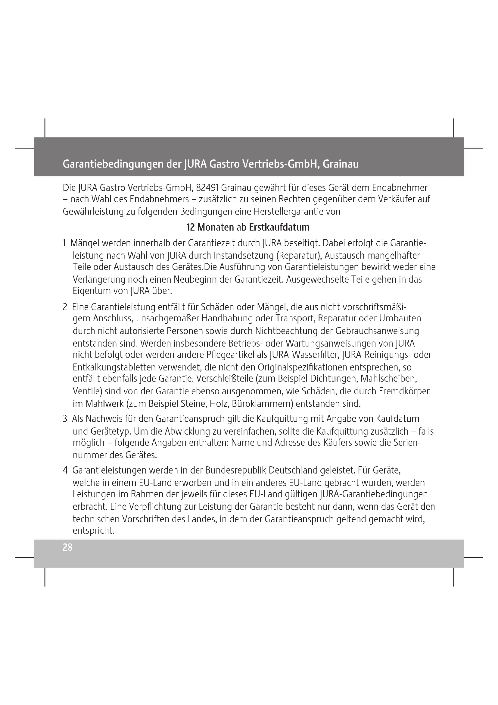 LED-Anzeigen Z LED leuchtet nicht: Der Kaffeevollautomat ist ausgeschaltet, der Smart Connect wird nicht mit Strom versorgt. Z LED leuchtet: Die Wireless-Verbindung zwischen Smart Connect und Peripheriegerät ist hergestellt. Z LED blinkt (1 Mal / Sek.): Es wird versucht, eine Wireless-Verbindung aufzubauen. Verbinden mit anderen Geräten Der Smart Connect kann für verschiedene Wireless-fähige Peripheriegeräte verwendet werden. T Platzieren Sie das Peripheriegerät neben dem Kaffeevollautomaten (im Abstand von max. 0,5 m). T Schalten Sie das Peripheriegerät und den Kaffeevollautomat ein. T Drücken Sie die Reset-Taste des Smart Connect (z.B. mit einem Kugelschreiber). T Drücken Sie anschließend (innerhalb von 30 Sek.) die Reset-Taste des Peripheriegerätes. Die LED leuchtet, um die erfolgreiche Verbindung mit dem Peripheriegerät anzuzeigen. Wird ein Gerät aus- und wieder eingeschaltet, so wird die Wireless-Verbindung automatisch wieder hergestellt. Kontakt JURA Elektroapparate AG Kaffeeweltstraße 10 CH-4626 Niederbuchsiten Tel. +41 (0)62 389 82 33 Weitere Kontaktdaten für Ihr Land finden Sie online unter www.jura.com.6 en Instructions for Use – JURA Smart Connect Proper use The Smart Connect may only be used with specifi ed JURA coff ee machines. It provides wireless communication between the coff ee machine and various accessories (for compatible devices see www.jura.com). Use for any other purpose will be deemed improper. JURA cannot accept any responsibility for the consequences of improper use. Smart Connect at a glance Installation The Smart Connect must be inserted into the coff ee machine's service socket. This is usually on the top or back of the machine, beneath a removable cover. If you don't know where the service socket of your coff ee machine is, ask your dealer or visit www.jura.com. T Plug the Smart Connect into the coff ee machine's service socket. The Smart Connect switches on automatically. For operation, the accessory must be no more than 3 m away from the coff ee machine.