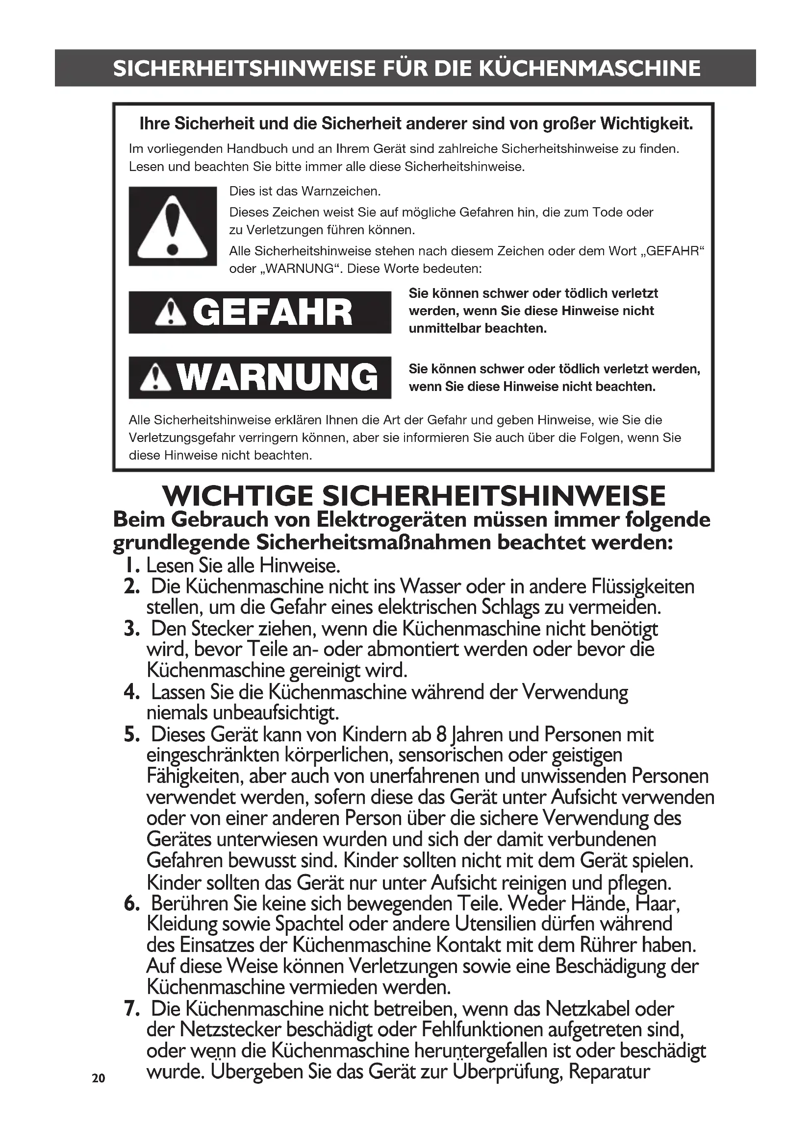Garantie für die KitchenAid-Küchenmaschine .................................................. 32 Kundendienst .................................................................................................... 32 INHALTSVERZEICHNIS20 WICHTIGE SICHERHEITSHINWEISE Beim Gebrauch von Elektrogeräten müssen immer folgende grundlegende Sicherheitsmaßnahmen beachtet werden:
