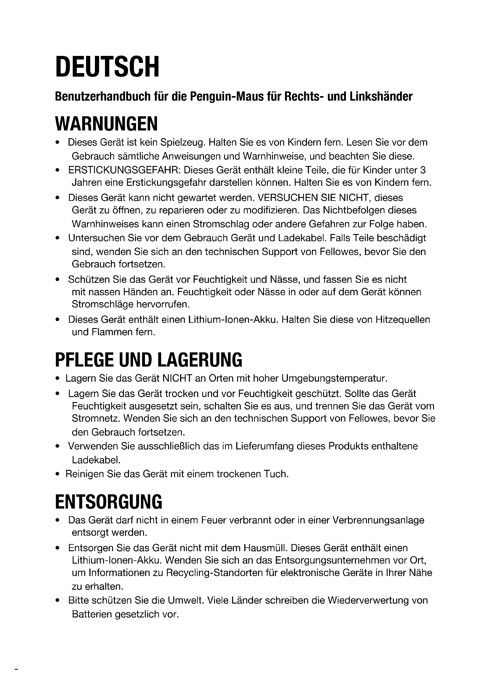 - Versuchen Sie, Ihre Penguin-Maus an einen anderen Computer bzw. ein anderes Notebook anzuschließen, um damit zu testen, ob das Problem weiterhin besteht.WICHTIGE INFORMATIONEN Gesundheit Eine lange Verweildauer am Arbeitsplatz ohne regelmäßige Pausen kann Unbehagen erzeugen. Sollte das Unbehagen fortdauern, konsultieren Sie einen qualifizierten Mediziner. Benutzerhinweis/Wartung und Pflege Versuchen Sie, während der Verwendung der Penguin-Maus den Kontakt mit stark medizinisch behandelten Handcremes/Desinfektionsmitteln zu vermeiden. Entfernen Sie regelmäßig Staub und Schmutz von der Unterseite Ihrer Penguin-Maus, um damit ein sanftes Gleiten des Geräts zu ermöglichen. Haftungsausschluss Wir unternehmen große Anstrengungen sicherzustellen, dass die in dieser Anleitung aufgeführten Informationen und Verfahren zutreend und vollständig sind, wir übernehmen jedoch keine Haftung für eventuelle Fehler oder Auslassungen, und wir behalten uns das Recht vor, ohne vorherige Ankündigung Änderungen vorzunehmen. Zwei (2) Jahre beschränkte Garantie auf die vertikale Fellowes Penguin-Maus für Rechts- und Linkshänder Fellowes, Inc. (das „Unternehmen“) garantiert für die Dauer von zwei (2) Jahren ab dem ursprünglichen Kaufdatum des Produkts, dass dieses frei von Material- und Herstellungsfehlern ist. Sollte ein solcher Fehler während des Garantiezeitraums auftreten, sorgt das Unternehmen (in seinem alleinigen Ermessen) entweder für die Reparatur oder den Ersatz des fehlerhaften Produkts ohne Berechnung von Arbeits- oder Materialkosten, oder es erstattet den Kaufpreis zurück. Das Unternehmen kann ggf. verlangen, dass das Produkt auf Kosten des Kunden an einen durch den Kundenservice genannten Ort zurückgeschickt wird. Diese Garantie gilt nur für den ersten Käufer, der das Produkt im Einzelhandel erwirbt. Ausgeschlossen von der Garantie sind Forderungen, die auf unsachgemäßen Gebrauch, die Missachtung von Installations- und Gebrauchsanweisungen, Nachlässigkeit, die Verwendung nicht zugelassener Zusatzgeräte, kommerzielle Nutzung, den Betrieb bei Strom- oderSpannungsbedingungen außerhalb der Spezifikation oder unerlaubte Wartung während des Garantiezeitraums, außerhalb der vorliegenden Garantiebedingungen, zurückzuführen sind.