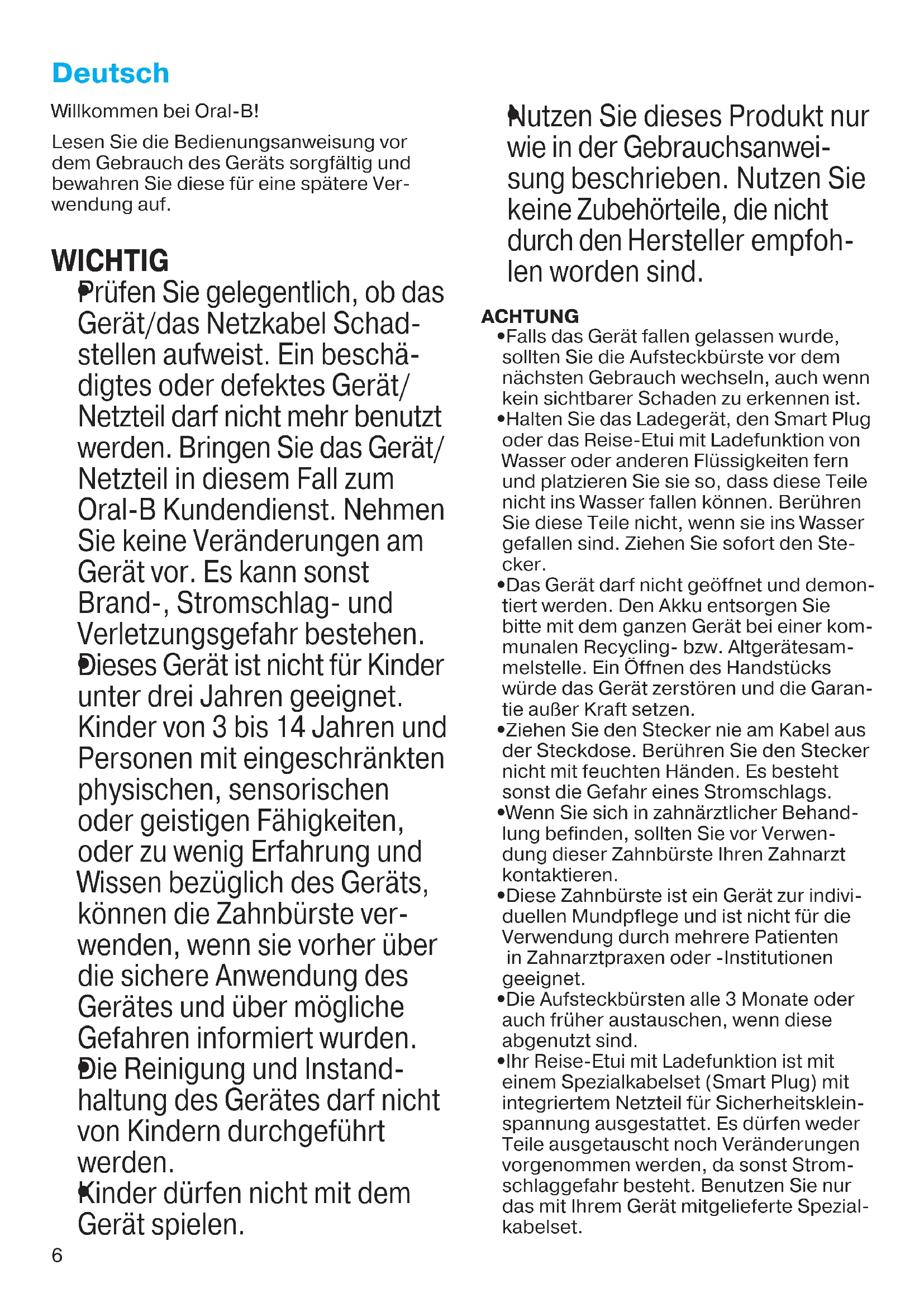 Die Aufsteckbürsten alle 3 Monate oder auch früher austauschen, wenn diese abgenutzt sind. - Ihr Reise-Etui mit Ladefunktion ist mit einem Spezialkabelset (Smart Plug) mit integriertem Netzteil für Sicherheitskleinspannung ausgestattet. Es dürfen weder Teile ausgetauscht noch Veränderungen vorgenommen werden, da sonst Stromschlaggefahr besteht. Benutzen Sie nur das mit ihrem Gerät mitgelieferte Spezialkabelset.