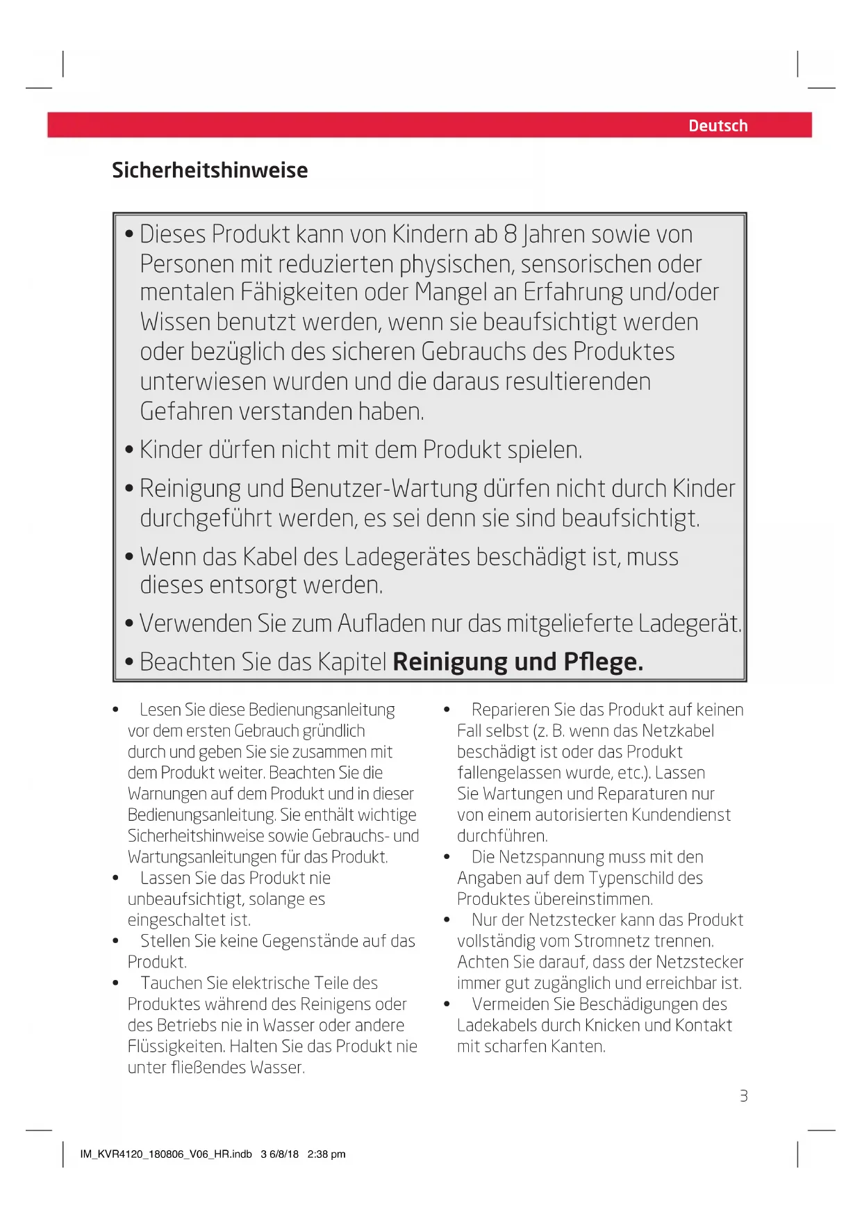 - Vermeiden Sie Beschädigungen des Ladekabels durch Knicken und Kontakt mit scharfen Kanten. IM_KVR4120_180806_V06_HR.indb 3 6/8/18 2:38 pmDeutsch