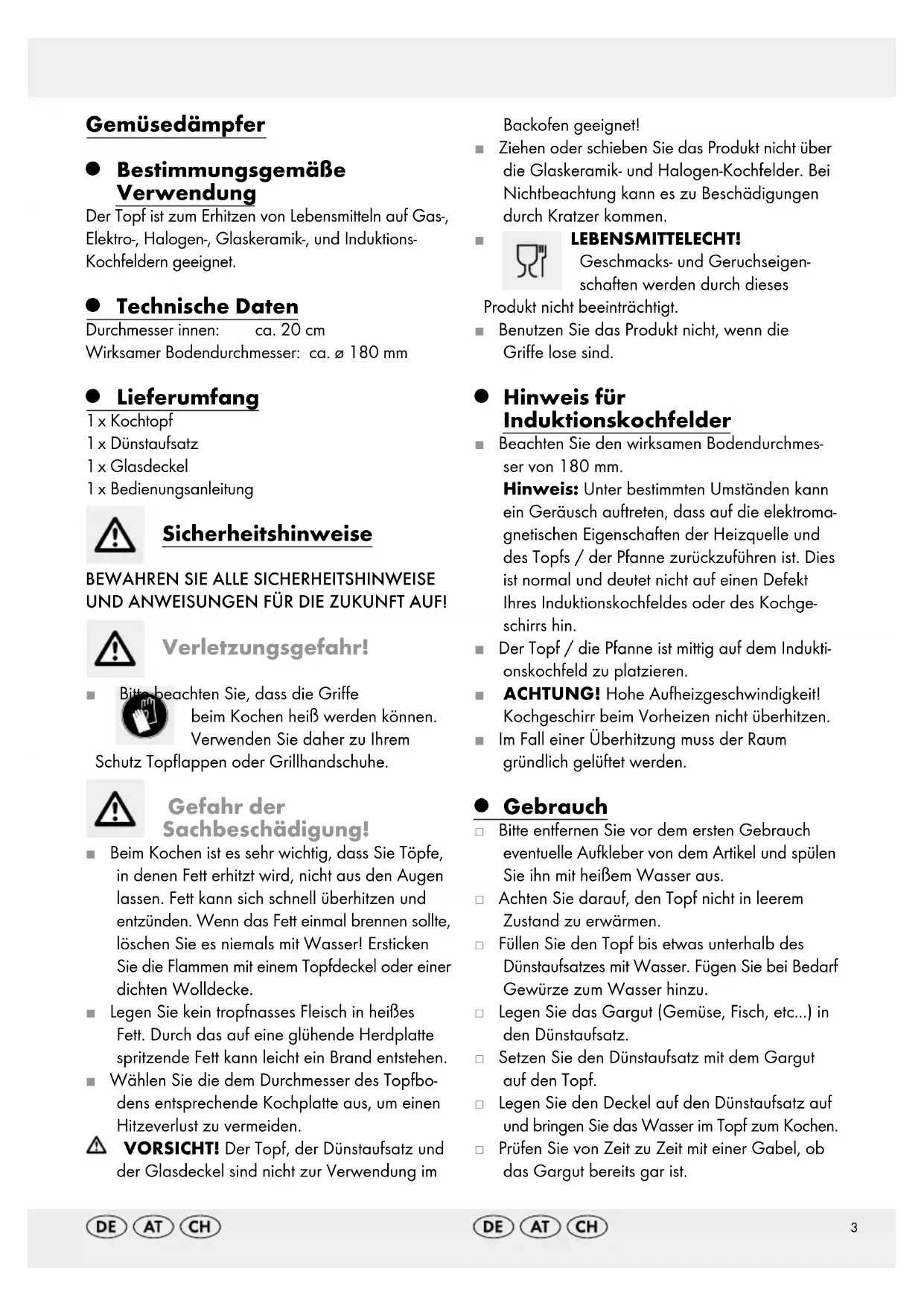 Lieferumfang 1 x Kochtopf 1 x Dünstaufsatz 1 x Glasdeckel 1 x Bedienungsanleitung Sicherheitshinweise