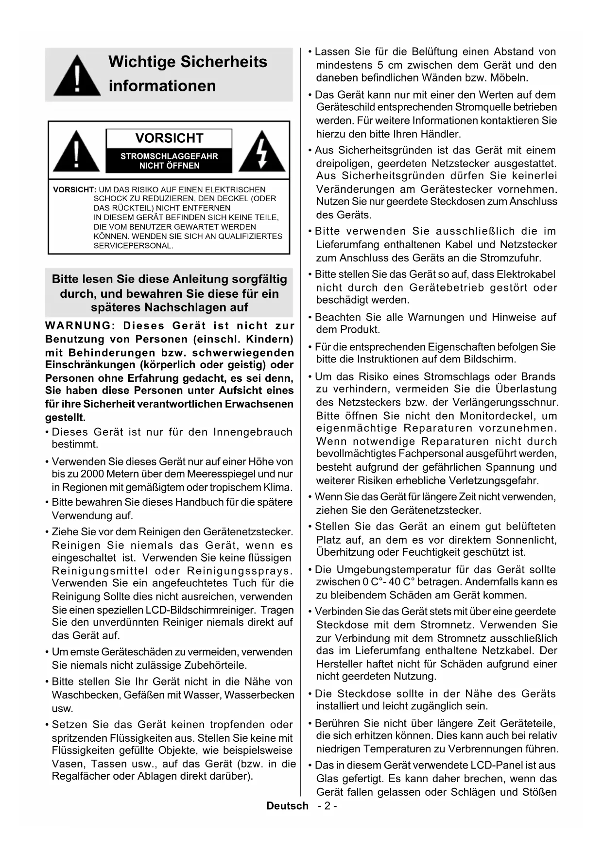 - Das in diesem Gerät verwendete LCD-Panel ist aus Glas gefertigt. Es kann daher brechen, wenn das Gerät fallen gelassen oder Schlägen und Stößen Wichtige Sicherheits informationen VORSICHT STROMSCHLAGGEFAHR NICHT ÖFFNEN VORSICHT: UM DAS RISIKO AUF EINEN ELEKTRISCHEN SCHOCK ZU REDUZIEREN, DEN DECKEL (ODER DAS RÜCKTEIL) NICHT ENTFERNEN IN DIESEM GERÄT BEFINDEN SICH KEINE TEILE, DIE VOM BENUTZER GEWARTET WERDEN KÖNNEN. WENDEN SIE SICH AN QUALIFIZIERTES SERVICEPERSONAL. Bitte lesen Sie diese Anleitung sorgfältig durch, und bewahren Sie diese für ein späteres Nachschlagen auf WARNUNG: Dieses Gerät ist nicht zur Benutzung von Personen (einschl. Kindern) mit Behinderungen bzw. schwerwiegenden Einschränkungen (körperlich oder geistig) oder Personen ohne Erfahrung gedacht, es sei denn, Sie haben diese Personen unter Aufsicht eines für ihre Sicherheit verantwortlichen Erwachsenen gestellt.
