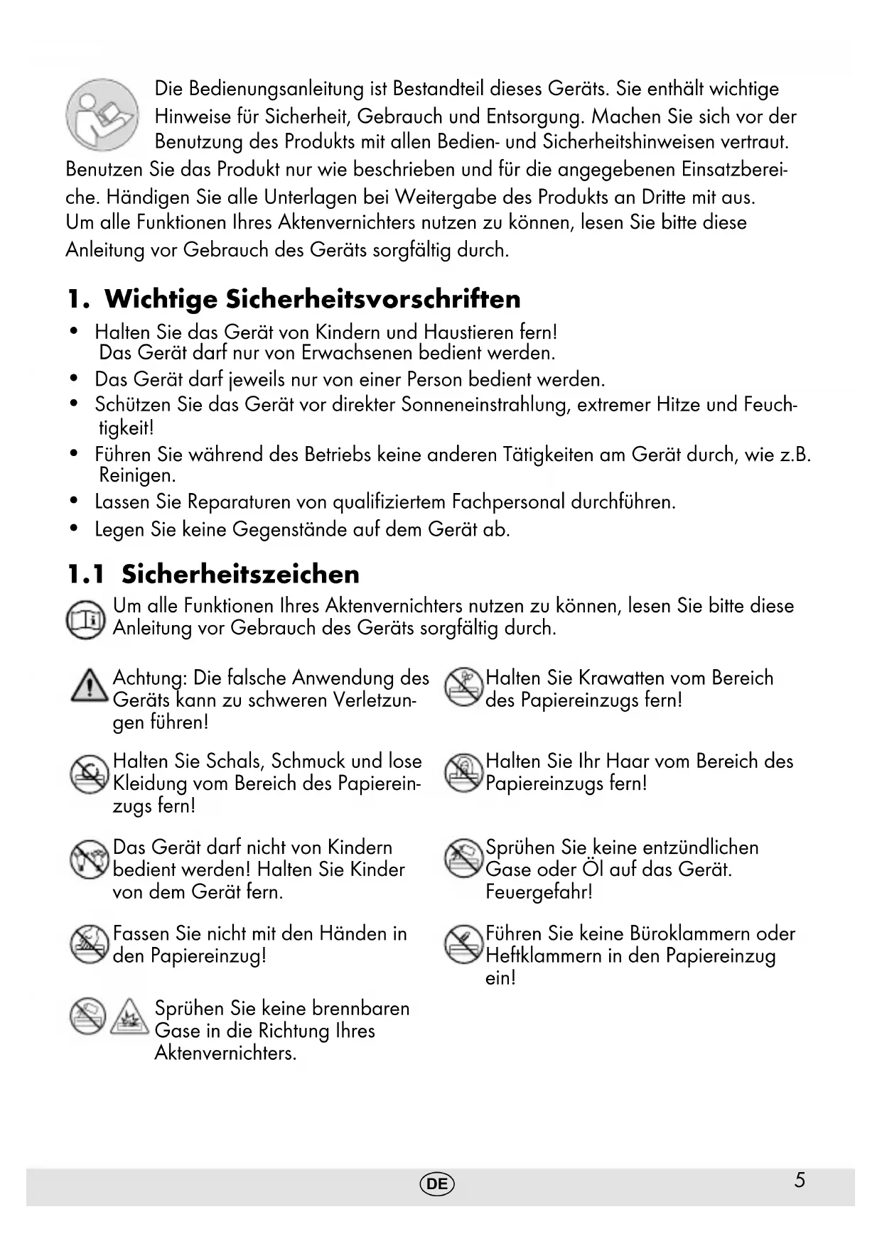 Um alle Funktionen Ihres Aktenvernichters nutzen zu können, lesen Sie bitte diese Anleitung vor Gebrauch des Geräts sorgfältig durch. Achtung: Die falsche Anwendung des Geräts kann zu schweren Verletzun- gen führen! Halten Sie Krawatten vom Bereich des Papiereinzugs fern! Halten Sie Schals, Schmuck und lose Kleidung vom Bereich des Papierein- zugs fern! Halten Sie Ihr Haar vom Bereich des Papiereinzugs fern! Das Gerät darf nicht von Kindern bedient werden! Halten Sie Kinder von dem Gerät fern. Sprühen Sie keine entzündlichen Gase oder Öl auf das Gerät. Feuergefahr! Fassen Sie nicht mit den Händen in den Papiereinzug! Führen Sie keine Büroklammern oder Heftklammern in den Papiereinzug ein! Sprühen Sie keine brennbaren Gase in die Richtung Ihres Aktenvernichters.6