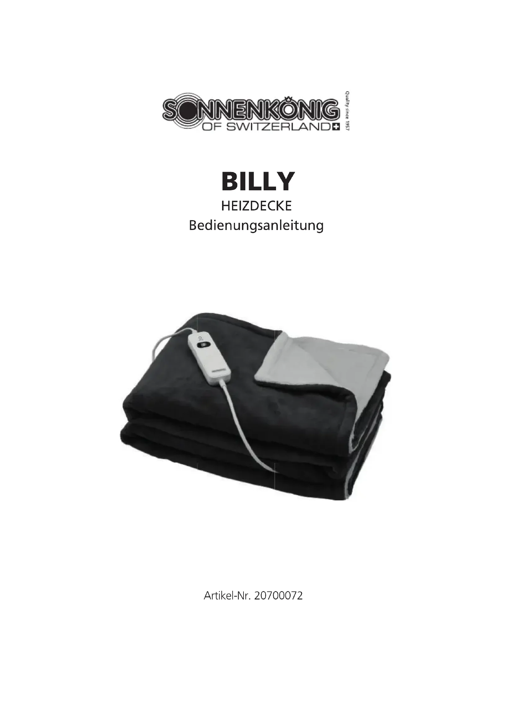Laden Sie die Anleitung für Ihr Heizdecke/-kissen kostenlos im PDF-Format! Finden Sie Ihr Handbuch Billy - Sonnenkönig und nehmen Sie Ihr elektronisches Gerät wieder in die Hand. Auf dieser Seite sind alle Dokumente veröffentlicht, die für die Verwendung Ihres Geräts notwendig sind. Billy von der Marke Sonnenkönig.