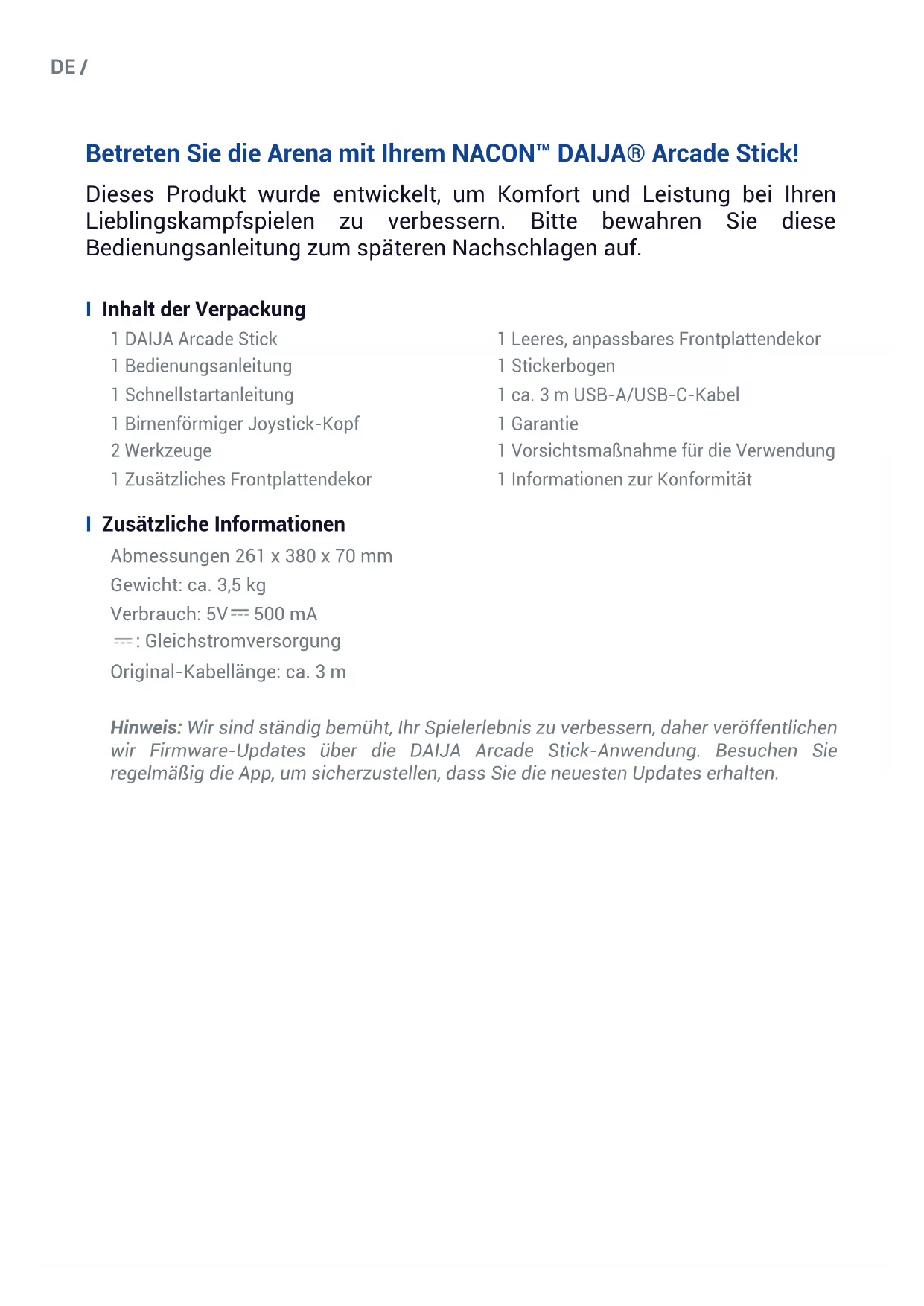 @NaconGaming Nacongaming Nacon International Licensed for sale in the European Union, United Kingdom, Australia, New Zealand, United States, Canada. Manufactured by Nacon. - Licencié pour la vente en Union européenne, Royaume-Uni, Australie, Nouvelle-Zélande, États-Unis, Canada. Fabriqué par Nacon. - Lizenziert für den Verkauf in der Europäischen Union, Großbritannien, Australien, Neuseeland, den USA und Kanada. Hergestellt von Nacon. - Verkoopvergunning voor de Europese Unie, het Verenigd Koninkrijk, Australië, Nieuw-Zeeland, de Verenigde Staten en Canada. Vervaardigd door Nacon. - Autorizado para la venta en la Unión Europea, Reino Unido, Australia, Nueva Zelanda, Estados Unidos y Canadá. Fabricado por Nacon. - Autorizzato alla vendita in Unione Europea, Regno Unito, Australia, Nuova Zelanda, Stati Uniti e Canada. Prodotto da Nacon. - Licenciado para venda na União Europeia, Reino Unido, Austrália, Nova Zelândia, Estados Unidos, Canadá. Fabricado pela Nacon. All the trademarks belong to their respective owners. - Toutes les marques citées appartiennent à leurs propriétaires respectifs.“1”, “PlayStation”, “PS5”, “PS4” and “PlayStation Shapes Logo” are registered trademarks or trademarks of Sony Interactive Entertainment Inc. All other trademarks are the property of their respective owners. Manufactured and distributed under license by Sony Interactive Entertainment. © 2022 NACON Made in China START GUIDE For PS5™, PS4™DE / Betreten Sie die Arena mit Ihrem NACON™ DAIJA® Arcade Stick! Dieses Produkt wurde entwickelt, um Komfort und Leistung bei Ihren Lieblingskampfspielen zu verbessern. Bitte bewahren Sie diese Bedienungsanleitung zum späteren Nachschlagen auf. I Inhalt der Verpackung I Zusätzliche Informationen Abmessungen 261 x 380 x 70 mm Gewicht: ca. 3,5 kg Verbrauch: 5V 500 mA : Gleichstromversorgung Original-Kabellänge: ca. 3 m Hinweis: Wir sind ständig bemüht, Ihr Spielerlebnis zu verbessern, daher veröffentlichen wir Firmware-Updates über die DAIJA Arcade Stick-Anwendung. Besuchen Sie regelmäßig die App, um sicherzustellen, dass Sie die neuesten Updates erhalten. 1 DAIJA Arcade Stick 1 Bedienungsanleitung 1 Schnellstartanleitung 1 Birnenförmiger Joystick-Kopf 2 Werkzeuge 1 Zusätzliches Frontplattendekor 1 Leeres, anpassbares Frontplattendekor 1 Stickerbogen 1 ca. 3 m USB-A/USB-C-Kabel 1 Garantie 1 Vorsichtsmaßnahme für die Verwendung 1 Informationen zur KonformitätDE / I Beschreibung der Elemente 01 Taste zum Entriegeln der oberen Abdeckung 02 Schrauben der Frontplatte 03 Joystick (nur digitaler Modus) 04 Aktionstasten (Kreuz, Kreis, Quadrat, Dreieck/L1/R1/L2/R2) 05 3,5-mm-Headset-Anschluss 06 Spieler-LED 07 PS-Taste 08 CREATE (PS5™-Modus)/SHARE (PS4™- Modus) 09 RSB-Taste 10 LSB-Taste 11 Optionen 12 Auswahl des Joystick-Modus 13 Auswahl der Plattform (PS5™ Konsole – PS4™ Konsole – PC*) 14 Kabelaufbewahrungsfach (im Inneren) 15 Prol-Taste 16 Prol-LEDs 17 Funktion zum Sperren (LOCK) 18 USB-C-Anschluss 19 Touchpad
