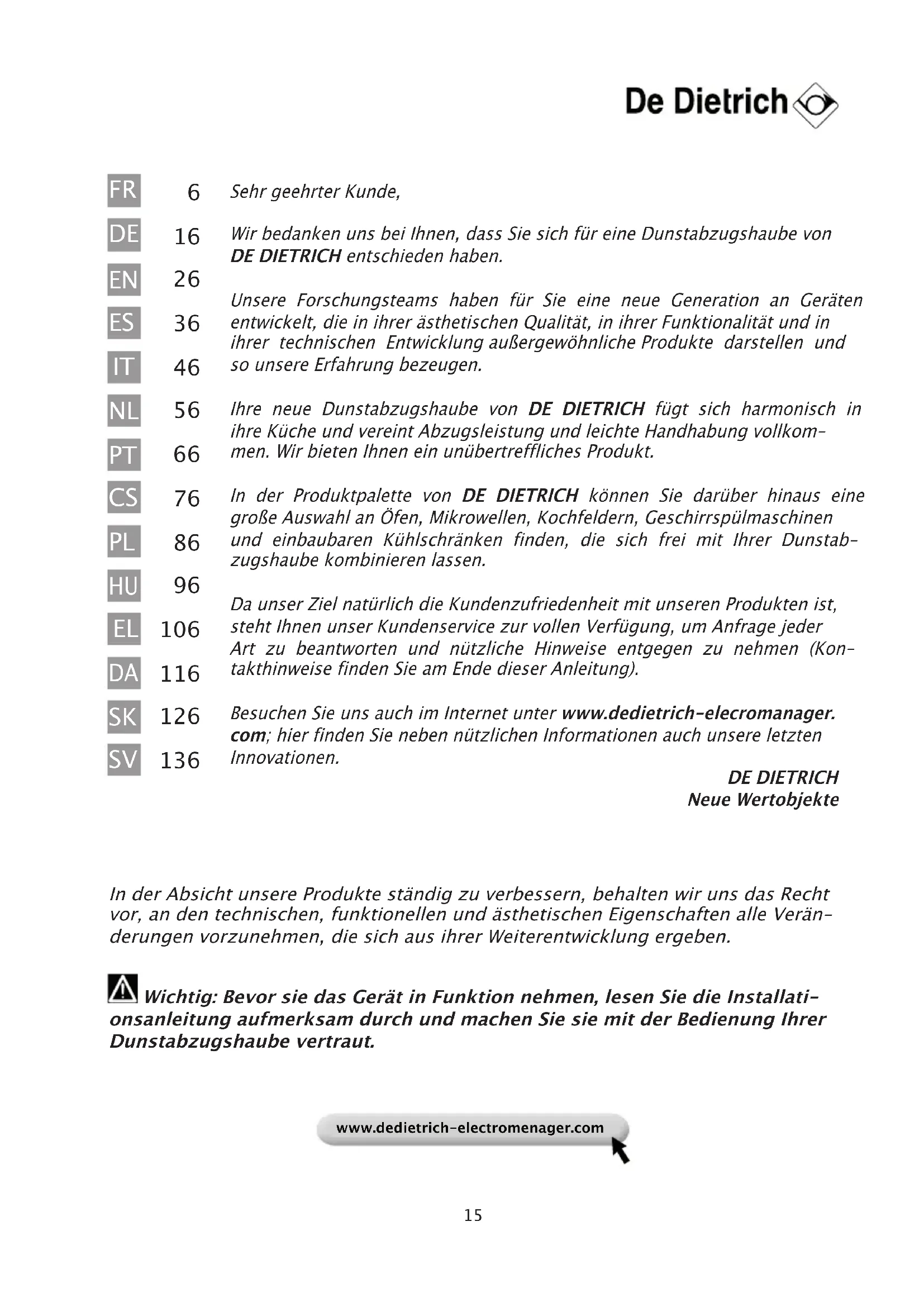 www.dedietrich-electromenager.com In der Absicht unsere Produkte ständig zu verbessern, behalten wir uns das Recht vor, an den technischen, funktionellen und ästhetischen Eigenschaften alle Verän- derungen vorzunehmen, die sich aus ihrer Weiterentwicklung ergeben. Wichtig: Bevor sie das Gerät in Funktion nehmen, lesen Sie die Installati- onsanleitung aufmerksam durch und machen Sie sie mit der Bedienung Ihrer Dunstabzugshaube vertraut.16 INHALT