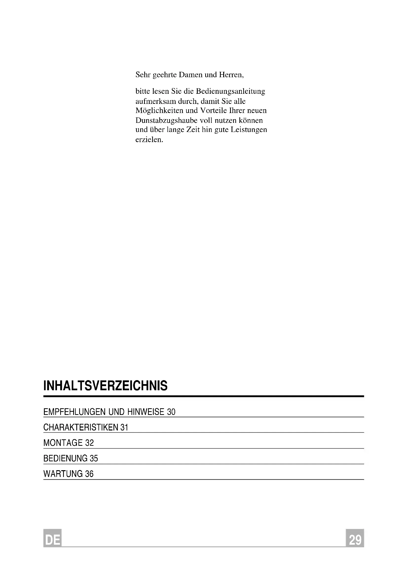 - Remonter le plafonnier.29DE INHALTSVERZEICHNIS Sehr geehrte Damen und Herren, bitte lesen Sie die Bedienungsanleitung aufmerksam durch, damit Sie alle Möglichkeiten und Vorteile Ihrer neuen Dunstabzugshaube voll nutzen können und über lange Zeit hin gute Leistungen erzielen.