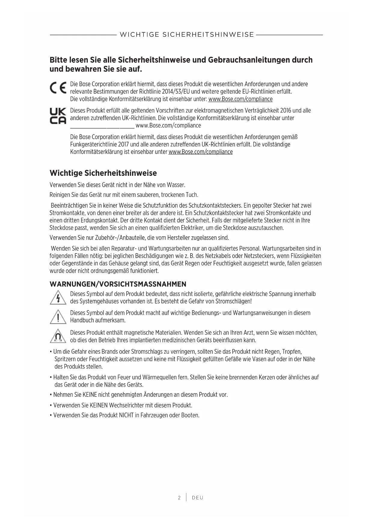 DEU Bitte lesen Sie alle Sicherheitshinweise und Gebrauchsanleitungen durch und bewahren Sie sie auf. Die Bose Corporation erklärt hiermit, dass dieses Produkt die wesentlichen Anforderungen und andere relevante Bestimmungen der Richtlinie 2014/53/EU und weitere geltende EU-Richtlinien erfüllt. Dievollständige Konformitätserklärung ist einsehbar unter: www.Bose.com/compliancewww.Bose.com/compliance Dieses Produkt erfüllt alle geltenden Vorschriften zur elektromagnetischen Verträglichkeit 2016 und alle anderen zutreffenden UK-Richtlinien. Die vollständige Konformitätserklärung ist einsehbar unter www.Bose.com/compliancewww.Bose.com/compliance Die Bose Corporation erklärt hiermit, dass dieses Produkt die wesentlichen Anforderungen gemäß Funkgeräterichtlinie 2017 und alle anderen zutreffenden UK-Richtlinien erfüllt. Die vollständige Konformitätserklärung ist einsehbar unter www.Bose.com/compliancewww.Bose.com/compliance Wichtige Sicherheitshinweise Verwenden Sie dieses Gerät nicht in der Nähe von Wasser. Reinigen Sie das Gerät nur mit einem sauberen, trockenen Tuch. Beeinträchtigen Sie in keiner Weise die Schutzfunktion des Schutzkontaktsteckers. Ein gepolter Stecker hat zwei Stromkontakte, von denen einer breiter als der andere ist. Ein Schutzkontaktstecker hat zwei Stromkontakte und einen dritten Erdungskontakt. Der dritte Kontakt dient der Sicherheit. Falls der mitgelieferte Stecker nicht in Ihre Steckdose passt, wenden Sie sich an einen qualifizierten Elektriker, um die Steckdose auszutauschen. Verwenden Sie nur Zubehör-/Anbauteile, die vom Hersteller zugelassen sind. Wenden Sie sich bei allen Reparatur- und Wartungsarbeiten nur an qualifiziertes Personal. Wartungsarbeiten sind in folgenden Fällen nötig: bei jeglichen Beschädigungen wie z.B. des Netzkabels oder Netzsteckers, wenn Flüssigkeiten oder Gegenstände in das Gehäuse gelangt sind, das Gerät Regen oder Feuchtigkeit ausgesetzt wurde, fallen gelassen wurde oder nicht ordnungsgemäß funktioniert. WARNUNGEN/VORSICHTSMASSNAHMEN Dieses Symbol auf dem Produkt bedeutet, dass nicht isolierte, gefährliche elektrische Spannung innerhalb des Systemgehäuses vorhanden ist. Es besteht die Gefahr von Stromschlägen! Dieses Symbol auf dem Produkt macht auf wichtige Bedienungs- und Wartungsanweisungen in diesem Handbuch aufmerksam. Dieses Produkt enthält magnetische Materialien. Wenden Sie sich an Ihren Arzt, wenn Sie wissen möchten, ob dies den Betrieb Ihres implantierten medizinischen Geräts beeinflussen kann.