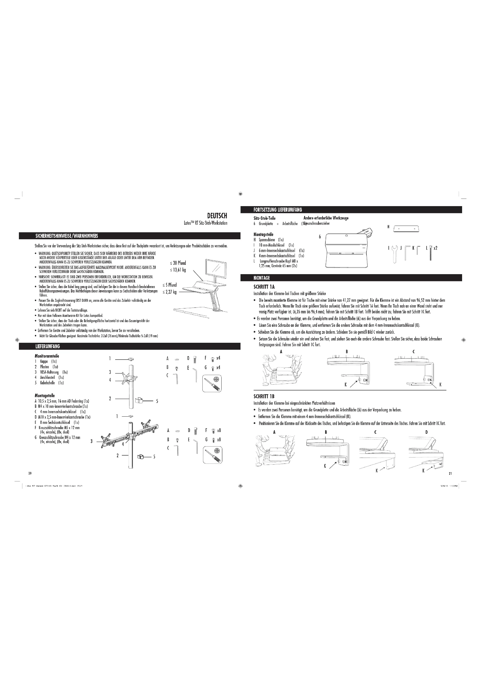 DEUTSCH Lotus™ RT Sitz-Steh-Workstation FORTSETZUNG LIEFERUMFANG SICHERHEITSHINWEISE/WARNHINWEIS LIEFERUMFANG ≤ 30 Pfund ≤ 13,61kg Monitorarmteile 1 Kappe (1x) 2 Pfosten (1x) 3 VESA-Halterung (1x) 4 Anschlussteil (1x) 5 Kabelschelle (1x) Montageteile A 10,5 x 2,5mm, 16mm AD Federring (1x) B M4 x 10mm-Innenvierkantschraube (1x) C 4mm-Innensechskantschlüssel (1x) D M10 x 2,5mm-Innenvierkantschraube (1x) E 8mm-Sechskantschlüssel (1x) F Kreuzschlitzschraube M5 x 12mm (4x,einzeln), (8x, dual) G Kreuzschlitzschraube M4 x 12mm (4x,einzeln), (8x, dual) Sitz-Steh-Teile 6 Grundplatte + Arbeitsfläche (1x) Montageteile H Spannschiene (1x) I 10mm-Maulschlüssel (1x) J 6mm-Innensechskantschlüssel (1x) K 4mm-Innensechskantschlüssel (1x)