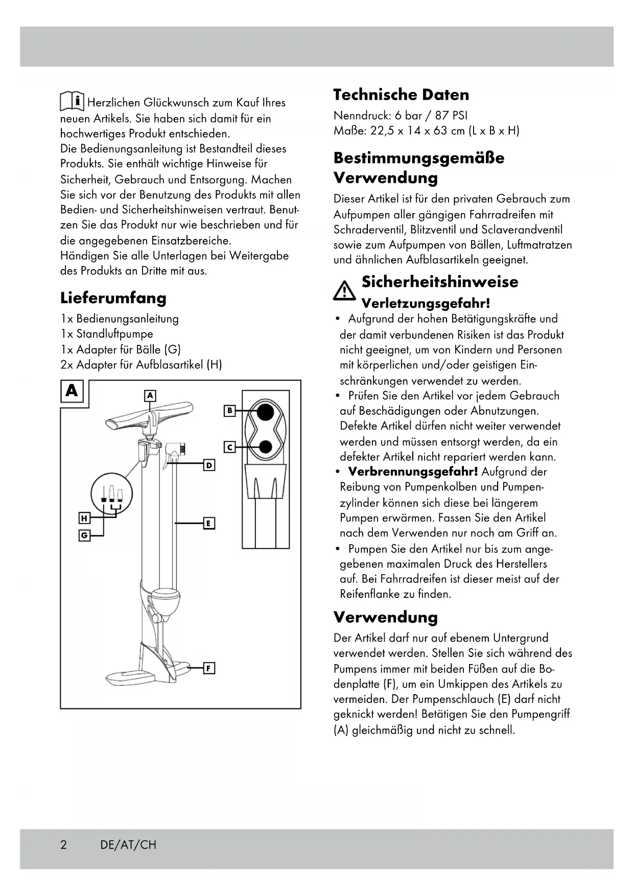 Istruzioni d‘uso POMPE À PIED Notice d’utilisation FLOOR PUMP Instructions for use FIETSPOMP Gebruiksaanwijzing2 Herzlichen Glückwunsch zum Kauf Ihres neuen Artikels. Sie haben sich damit für ein hochwertiges Produkt entschieden. Die Bedienungsanleitung ist Bestandteil dieses Produkts. Sie enthält wichtige Hinweise für Sicherheit, Gebrauch und Entsorgung. Machen Sie sich vor der Benutzung des Produkts mit allen Bedien- und Sicherheitshinweisen vertraut. Benut- zen Sie das Produkt nur wie beschrieben und für die angegebenen Einsatzbereiche. Händigen Sie alle Unterlagen bei Weitergabe des Produkts an Dritte mit aus. Lieferumfang 1x Bedienungsanleitung 1x Standluftpumpe 1x Adapter für Bälle (G) 2x Adapter für Aufblasartikel (H) Technische Daten Nenndruck: 6 bar / 87 PSI Maße: 22,5 x 14 x 63 cm (L x B x H) Bestimmungsgemäße Verwendung Dieser Artikel ist für den privaten Gebrauch zum Aufpumpen aller gängigen Fahrradreifen mit Schraderventil, Blitzventil und Sclaverandventil sowie zum Aufpumpen von Bällen, Luftmatratzen und ähnlichen Aufblasartikeln geeignet. Sicherheitshinweise Verletzungsgefahr!