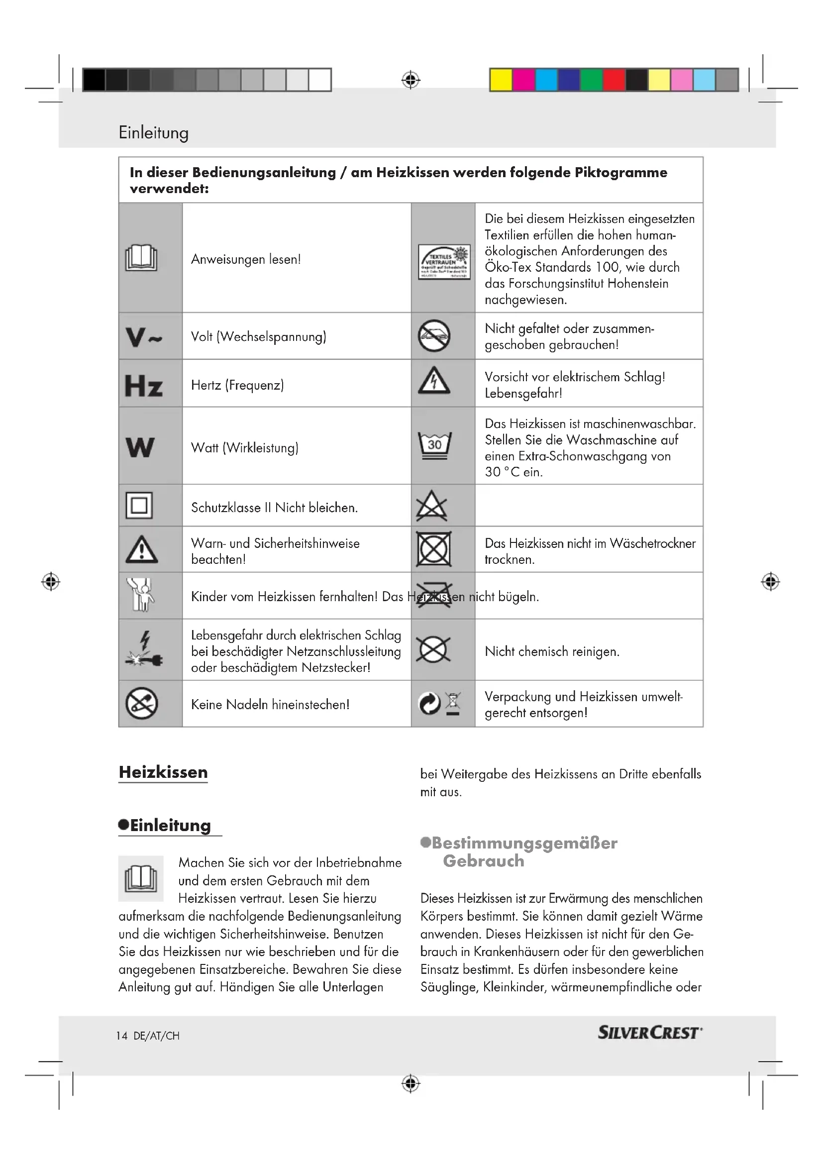 Déclaration de conformité Ce coussin chauffant est conforme aux exigences des directives européennes et nationales applicables. Le marquage CE en est l’indicateur. Les déclarations correspondantes sont disponibles auprès du fabricant.13 DE/AT/CH Inhaltsverzeichnis Einleitung Bestimmungsgemäßer Gebrauch .......................................................................................................Seite 14 Teilebeschreibung ...............................................................................................................................Seite 15 Lieferumfang ........................................................................................................................................ Seite 15 Technische Daten ................................................................................................................................Seite 15 Wichtige Sicherheitshinweise ........................................................................................Seite 15 Sicherheits-System ...................................................................................................................Seite 17 Inbetriebnahme Ein- / ausschalten / Temperatur wählen .............................................................................................Seite 17 Temperaturstufen ................................................................................................................................. Seite 18 Abschaltautomatik ...............................................................................................................................Seite 18 Reinigung und Pflege ............................................................................................................Seite 18 Lagerung .........................................................................................................................................Seite 19 Entsorgung .....................................................................................................................................Seite 19 Garantie / Service .....................................................................................................................Seite 19 Konformitätserklärung .......................................................................................................Seite 2014 DE/AT/CH Einleitung Heizkissen Einleitung Machen Sie sich vor der Inbetriebnahme und dem ersten Gebrauch mit dem Heizkissen vertraut. Lesen Sie hierzu aufmerksam die nachfolgende Bedienungsanleitung und die wichtigen Sicherheitshinweise. Benutzen Sie das Heizkissen nur wie beschrieben und für die angegebenen Einsatzbereiche. Bewahren Sie diese Anleitung gut auf. Händigen Sie alle Unterlagen bei Weitergabe des Heizkissens an Dritte ebenfalls mit aus. Bestimmungsgemäßer Gebrauch Dieses Heizkissen ist zur Erwärmung des menschlichen Körpers bestimmt. Sie können damit gezielt Wärme anwenden. Dieses Heizkissen ist nicht für den Ge- brauch in Krankenhäusern oder für den gewerblichen Einsatz bestimmt. Es dürfen insbesondere keine Säuglinge, Kleinkinder, wärmeunempfindliche oder In dieser Bedienungsanleitung / am Heizkissen werden folgende Piktogramme verwendet: Anweisungen lesen! Die bei diesem Heizkissen eingesetzten Textilien erfüllen die hohen human- ökologischen Anforderungen des Öko-Tex Standards 100, wie durch das Forschungsinstitut Hohenstein nachgewiesen. Volt (Wechselspannung) Nicht gefaltet oder zusammen- geschoben gebrauchen! Hertz (Frequenz) Vorsicht vor elektrischem Schlag! Lebensgefahr! Watt (Wirkleistung) Das Heizkissen ist maschinenwaschbar. Stellen Sie die Waschmaschine auf einen Extra-Schonwaschgang von 30 °C ein. Schutzklasse II Nicht bleichen. Warn- und Sicherheitshinweise beachten! Das Heizkissen nicht im Wäschetrockner trocknen. Kinder vom Heizkissen fernhalten! Das Heizkissen nicht bügeln. Lebensgefahr durch elektrischen Schlag bei beschädigter Netzanschlussleitung oder beschädigtem Netzstecker! Nicht chemisch reinigen. Keine Nadeln hineinstechen! Verpackung und Heizkissen umwelt- gerecht entsorgen!15 DE/AT/CH Einleitung / Wichtige Sicherheitshinweise hilflose Personen und keine Tiere erwärmt werden. Eine andere Verwendung als zuvor beschrieben oder eine Veränderung des Heizkissens ist nicht zulässig und kann zu Verletzungen und / oder Beschädigungen des Heizkissens führen. Für Schäden, deren Ursachen in bestimmungswidrigen Anwendungen liegen, übernimmt der Hersteller keine Haftung. Teilebeschreibung