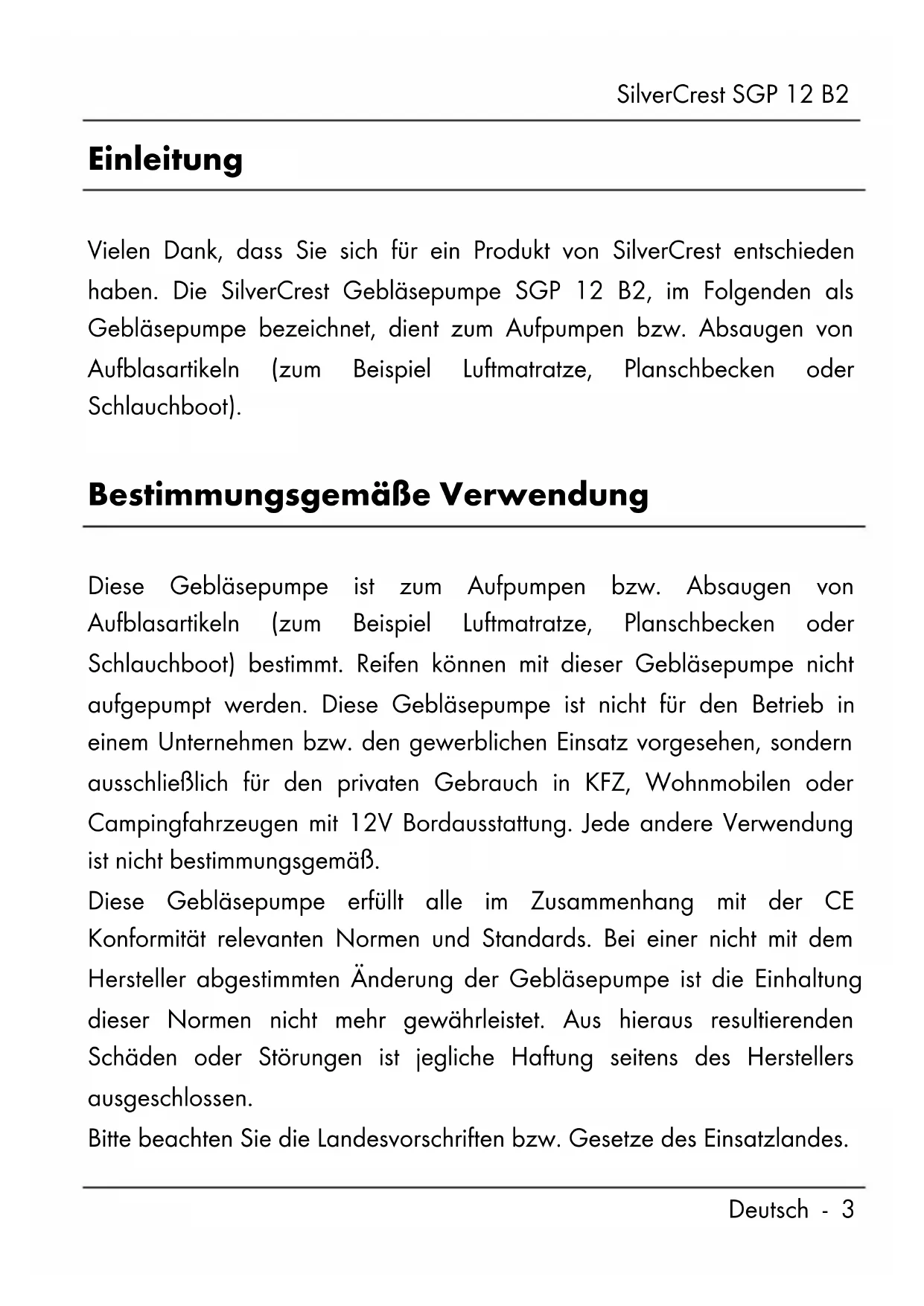 - Hinweise zu Garantie und Serviceabwicklung SilverCrest SGP 12 B2 Deutsch - 3 Einleitung Vielen Dank, dass Sie sich für ein Produkt von SilverCrest entschieden haben. Die SilverCrest Gebläsepumpe SGP 12 B2, im Folgenden als Gebläsepumpe bezeichnet, dient zum Aufpumpen bzw. Absaugen von Aufblasartikeln (zum Beispiel Luftmatratze, Planschbecken oder Schlauchboot). Bestimmungsgemäße Verwendung Diese Gebläsepumpe ist zum Aufpumpen bzw. Absaugen von Aufblasartikeln (zum Beispiel Luftmatratze, Planschbecken oder Schlauchboot) bestimmt. Reifen können mit dieser Gebläsepumpe nicht aufgepumpt werden. Diese Gebläsepumpe ist nicht für den Betrieb in einem Unternehmen bzw. den gewerblichen Einsatz vorgesehen, sondern ausschließlich für den privaten Gebrauch in KFZ, Wohnmobilen oder Campingfahrzeugen mit 12V Bordausstattung. Jede andere Verwendung ist nicht bestimmungsgemäß. Diese Gebläsepumpe erfüllt alle im Zusammenhang mit der CE Konformität relevanten Normen und Standards. Bei einer nicht mit dem Hersteller abgestimmten Änderung der Gebläsepumpe ist die Einhaltung dieser Normen nicht mehr gewährleistet. Aus hieraus resultierenden Schäden oder Störungen ist jegliche Haftung seitens des Herstellers ausgeschlossen. Bitte beachten Sie die Landesvorschriften bzw. Gesetze des Einsatzlandes.SilverCrest SGP 12 B2 p. 21