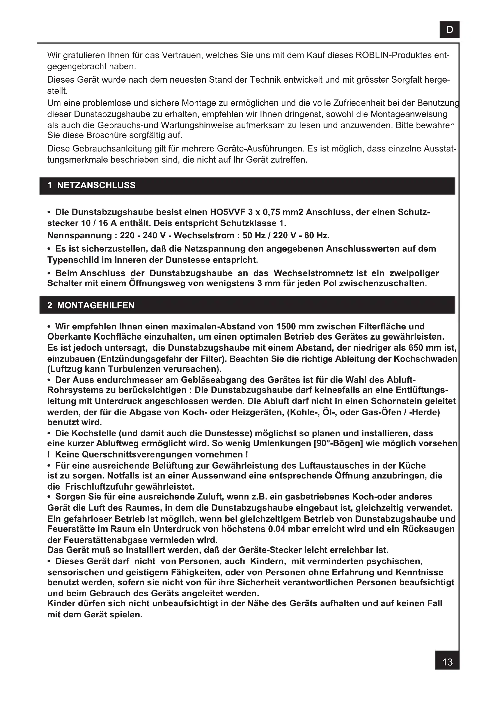 Wir gratulieren Ihnen für das Vertrauen, welches Sie uns mit dem Kauf dieses ROBLIN-Produktes ent- gegengebracht haben. Dieses Gerät wurde nach dem neuesten Stand der Technik entwickelt und mit grösster Sorgfalt herge- stellt. Um eine problemlose und sichere Montage zu ermöglichen und die volle Zufriedenheit bei der Benutzung dieser Dunstabzugshaube zu erhalten, empfehlen wir Ihnen dringenst, sowohl die Montageanweisung als auch die Gebrauchs-und Wartungshinweise aufmerksam zu lesen und anzuwenden. Bitte bewahren Sie diese Broschüre sorgfältig auf. Diese Gebrauchsanleitung gilt für mehrere Geräte-Ausführungen. Es ist möglich, dass einzelne Ausstat- tungsmerkmale beschrieben sind, die nicht auf Ihr Gerät zutreffen. 1 NETZANSCHLUSS