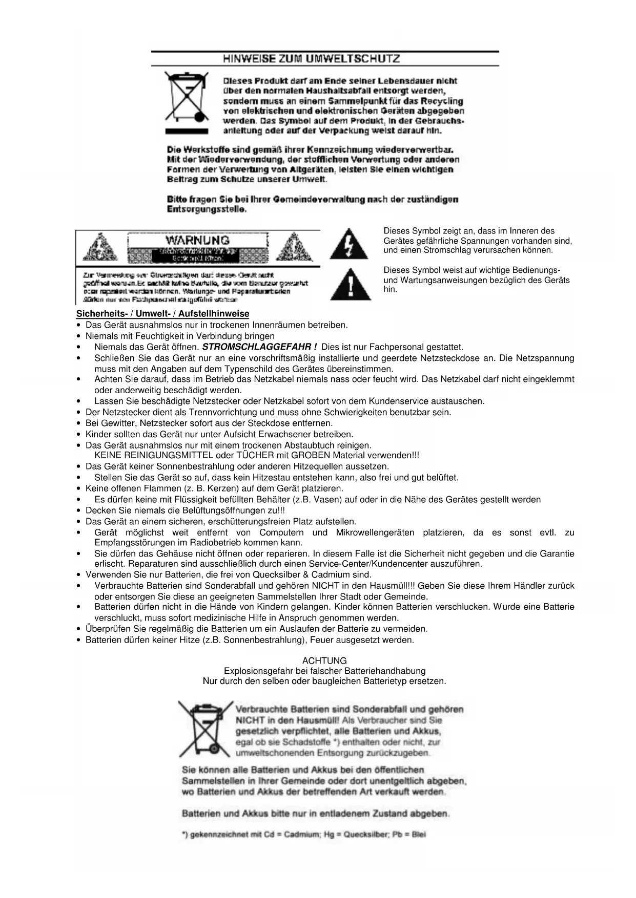 Verbrauchte Batterien sind Sonderabfall und gehoren NICT in den Hausmull!! Geben Sie diese Ihr hem Handler zuck oder entsorgen Sie die eine an geeigneten Sammelstellen ihrer Stadt oder Gemeinde. - Batterien dürfen nicht in die Höhe von Kindern gelangen. Kinder konnen Batterien verschlucken. Werde eine Batterie verschlukt, muss sofort medizinische Hilfe in Anspruch genommen werden.
