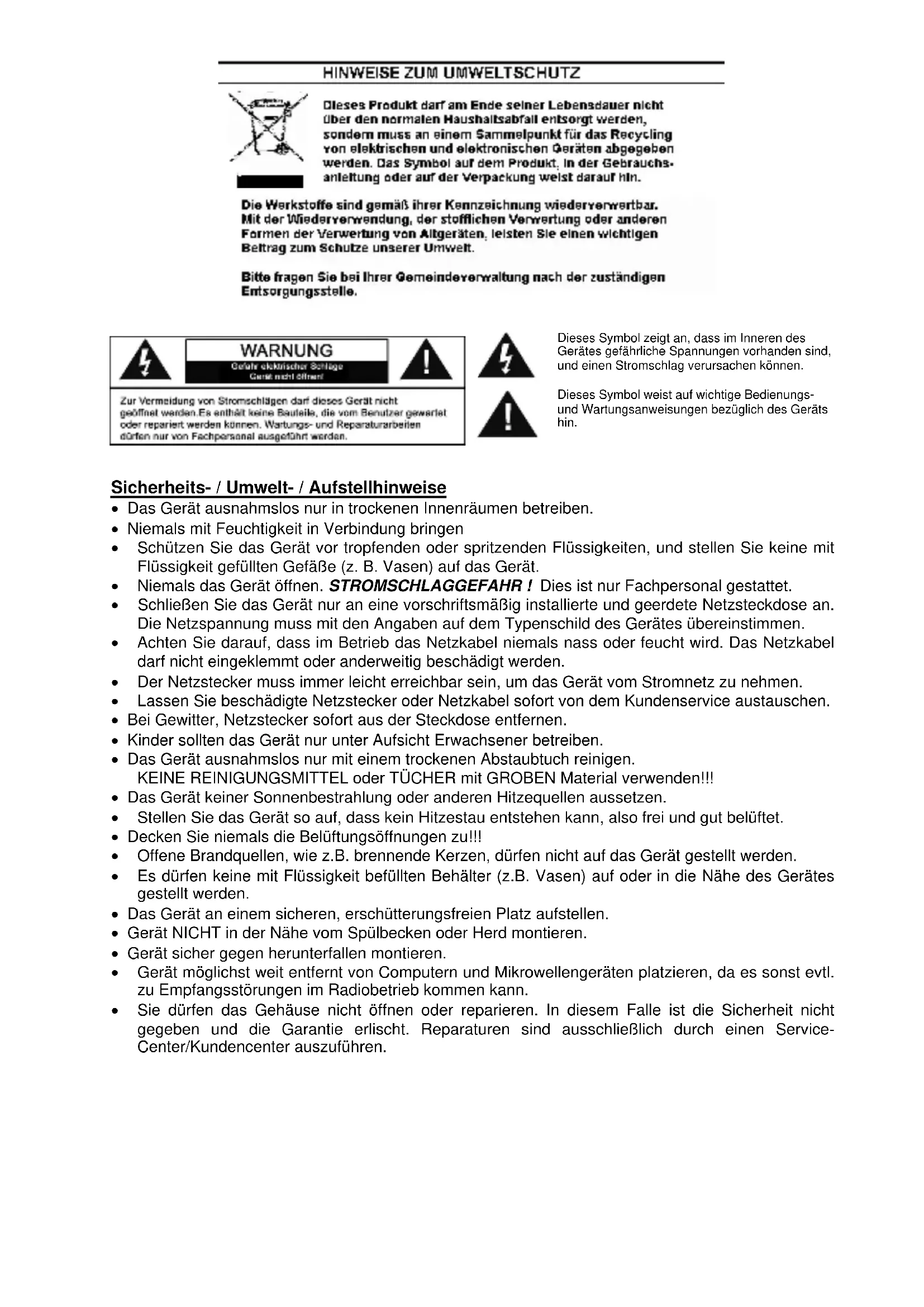 Sicherheits- / Umwelt- / Aufstellhinweise