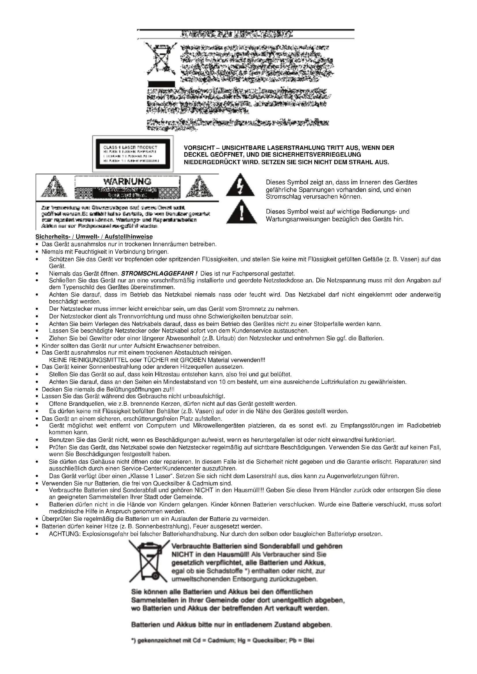 - Das Gerät verfügt über einen „Klasse 1 Laser“. Setzen Sie sich nicht dem Laserstrahl aus, dies kann zu Augenverletzungen führen.