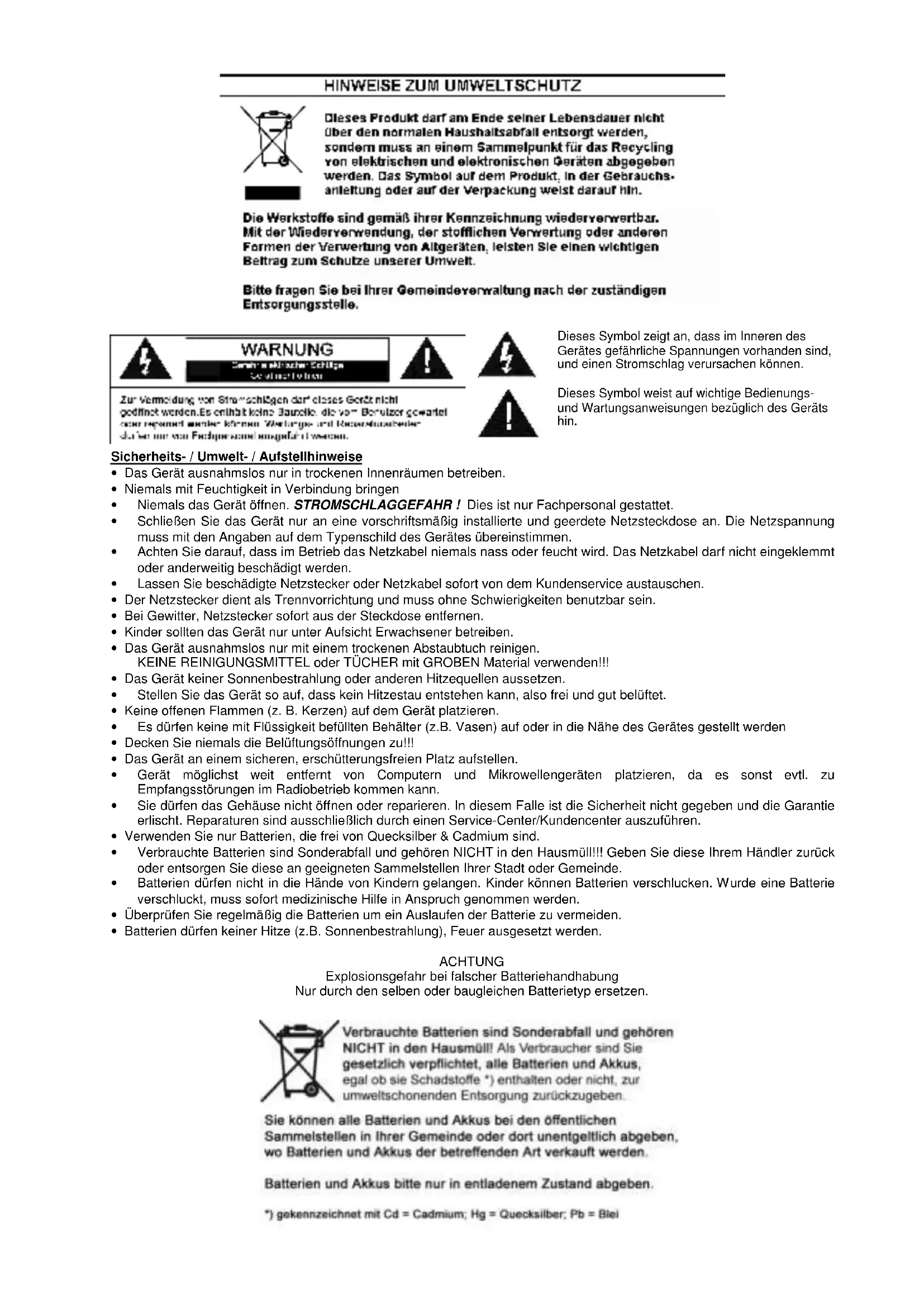 Verbrauchte Batterien sind Sonderabfall und gehoren NICT in den Hausmull!! Geben Sie diese Ihr hem Handler zuck oder entsorgen Sie die eine an geeigneten Sammelstellen ihrer Stadt oder Gemeinde. - Batterien dürfen nicht in die Höhe von Kindern gelangen. Kinder konnen Batterien verschlucken. Werde eine Batterie verschlucht, muss sofort medizinische Hilfe in Anspruch genommen werden.