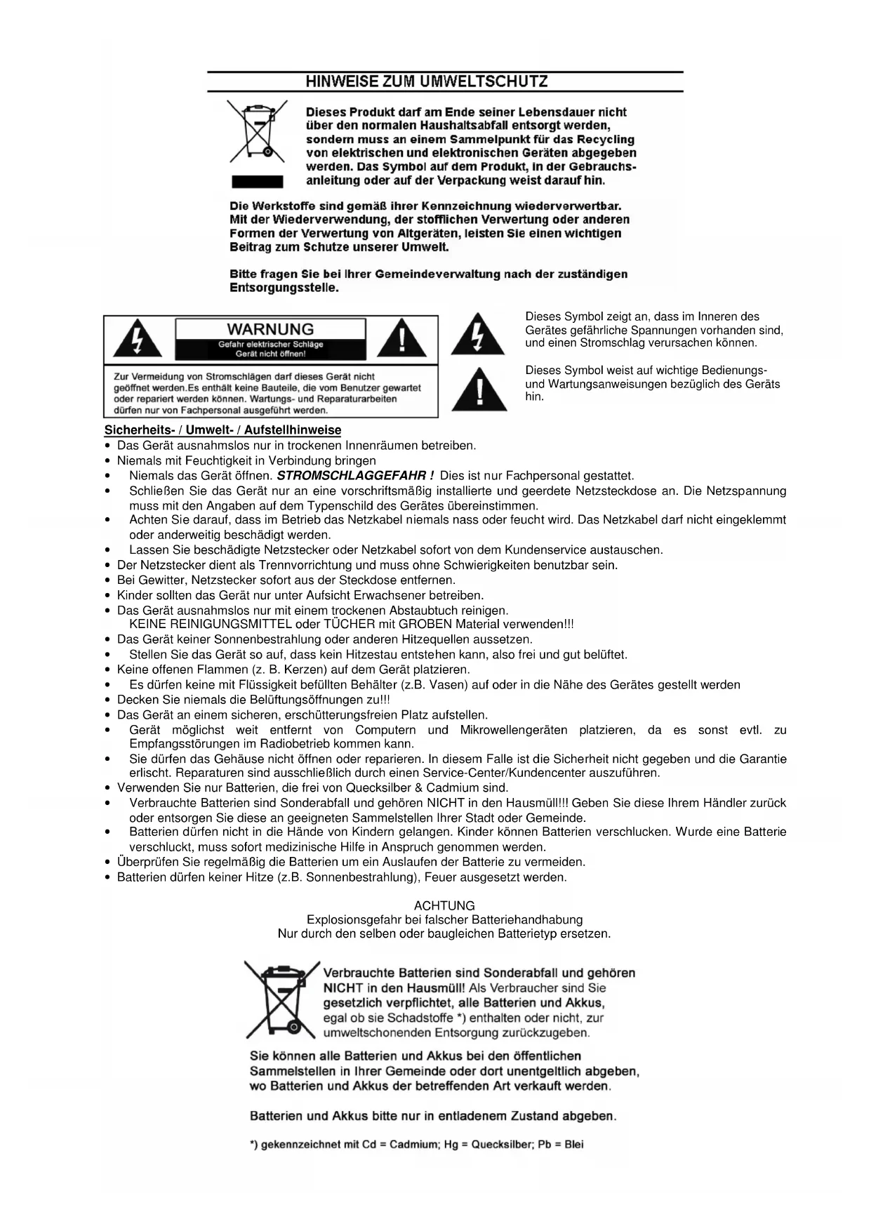 - Verbrauchte Batterien sind Sonderabfall und gehören NICHT in den Hausmüll!!! Geben Sie diese Ihrem Händler zurück oder entsorgen Sie diese an geeigneten Sammelstellen Ihrer Stadt oder Gemeinde.