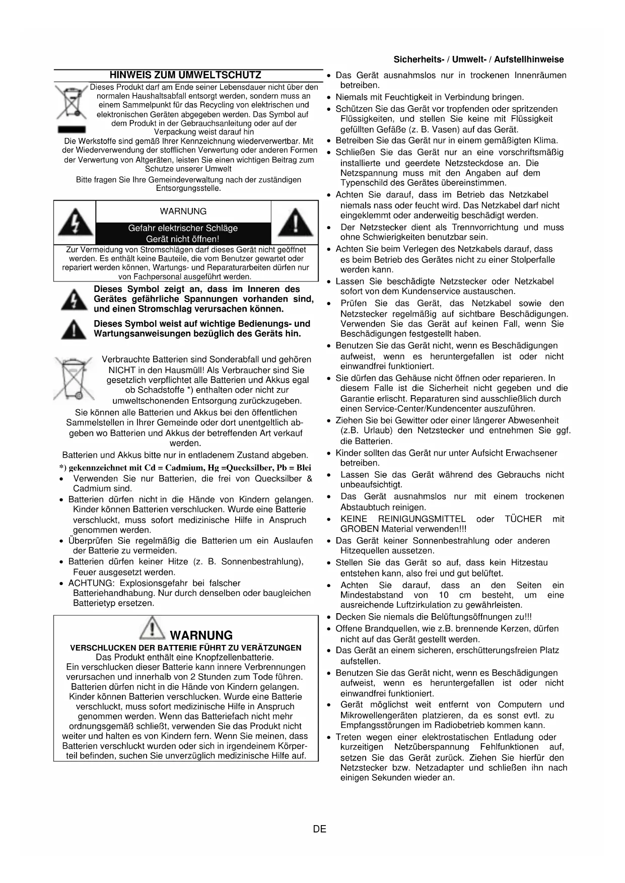 Ein verschlucken dieser Batterie kann innere Verbrennungen verursachen und innerhalb von 2 Stunden zum Tode führen. Batterien * dürfen nicht in die Höhe von Kindern gelangen. Kinder * konnen Batterien verschlucken. Werde eine Batterie verschlukt, muss sofort medizinische Hilde in Anspruch genommen werden. Wenn das Batteriefach nicht mehr ordnungsgemäß schließt, verwenden Sie das Produkt nicht weiter und halten es von Kindern fern. Wenn Sie meinen, dass Batterien verschlukt wurden oder sich in irgendinem Körpers-teil befinden, suchen Sie unverzüglich medizinische Hilfe auf.