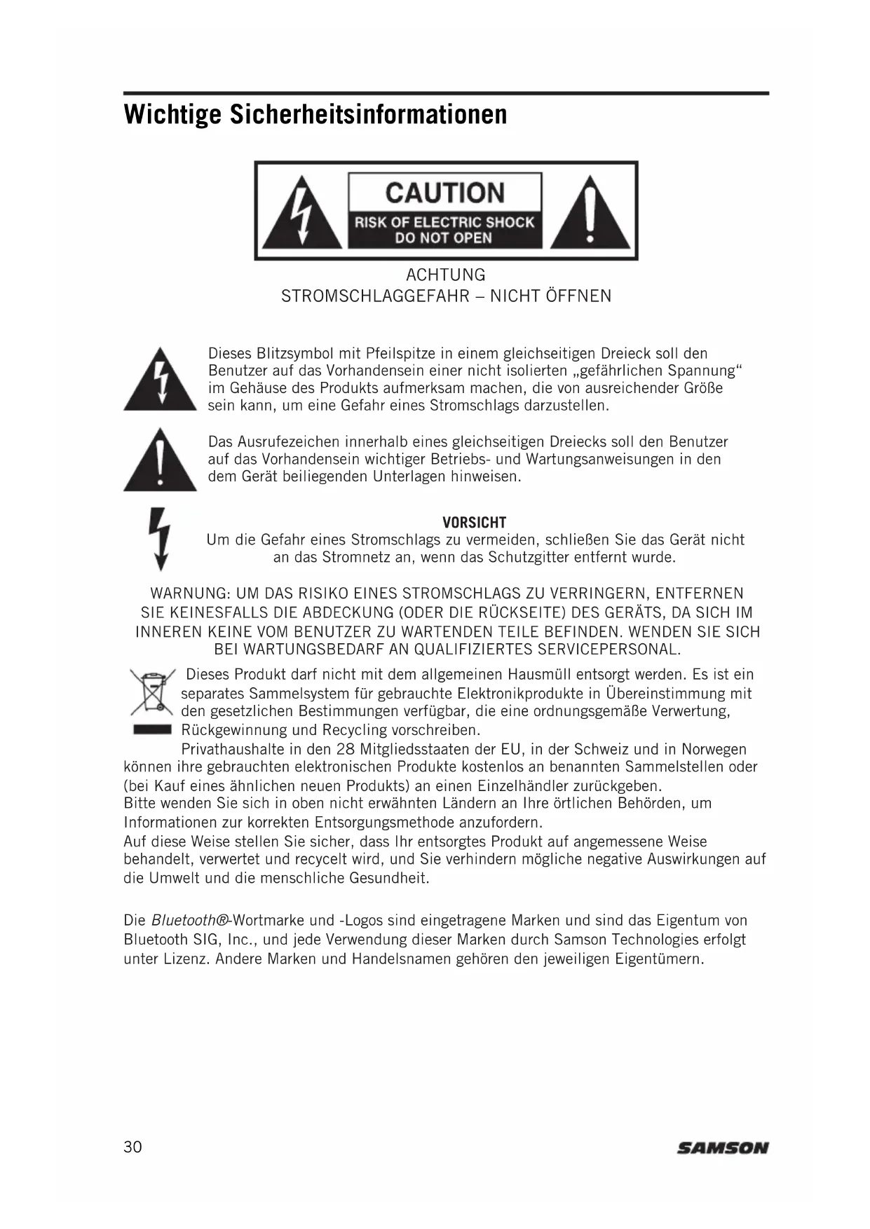 Die Bluetooth®-Wortmarke und -Logos sind eingetragene Marken und sind das Eigentum von Bluetooth SIG, Inc., und jeder Verwendung dieser Marken durch Samson Technologies erfolgt unter Lizenz. Andere Marken und Handelsnamen gehoren den jeweiligen Eigentümern.