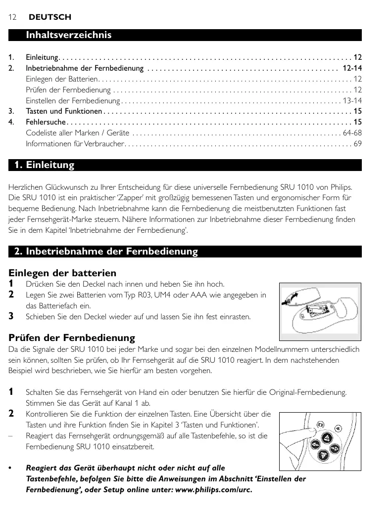 Einleitung. . . . . . . . . . . . . . . . . . . . . . . . . . . . . . . . . . . . . . . . . . . . . . . . . . . . . . . . . . . . . . . . . . . . . . . . 12 Inbetriebnahme der Fernbedienung . . . . . . . . . . . . . . . . . . . . . . . . . . . . . . . . . . . . . . . . . . . . . . . 12-14 Einlegen der Batterien. . . . . . . . . . . . . . . . . . . . . . . . . . . . . . . . . . . . . . . . . . . . . . . . . . . . . . . . . . . . . . . . . . . . 12 Prüfen der Fernbedienung . . . . . . . . . . . . . . . . . . . . . . . . . . . . . . . . . . . . . . . . . . . . . . . . . . . . . . . . . . . . . . . . 12 Einstellen der Fernbedienung . . . . . . . . . . . . . . . . . . . . . . . . . . . . . . . . . . . . . . . . . . . . . . . . . . . . . . . . . . . 13-14 Tasten und Funktionen . . . . . . . . . . . . . . . . . . . . . . . . . . . . . . . . . . . . . . . . . . . . . . . . . . . . . . . . . . . . . 15 Fehlersuche . . . . . . . . . . . . . . . . . . . . . . . . . . . . . . . . . . . . . . . . . . . . . . . . . . . . . . . . . . . . . . . . . . . . . . 15 Codeliste aller Marken / Geräte . . . . . . . . . . . . . . . . . . . . . . . . . . . . . . . . . . . . . . . . . . . . . . . . . . . . . . . . 64-68 Informationen für Verbraucher. . . . . . . . . . . . . . . . . . . . . . . . . . . . . . . . . . . . . . . . . . . . . . . . . . . . . . . . . . . . . 69