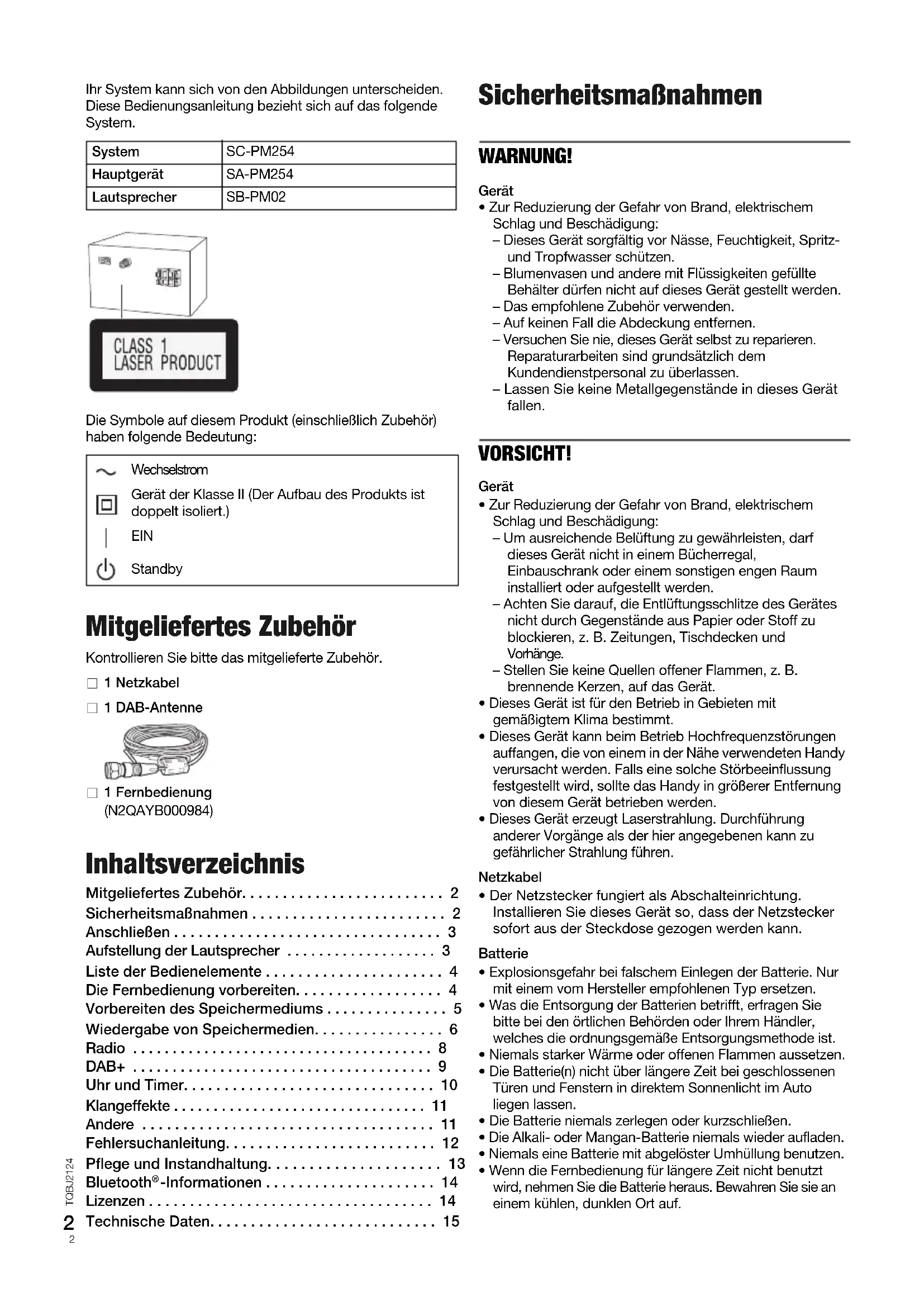 - Technische Daten Sicherheitsmaßnahmen WARNUNG! Gerät• Zur Reduzierung der Gefahr von Brand, elektrischem Schlag und Beschädigung:– Dieses Gerät sorgfältig vor Nässe, Feuchtigkeit, Spritz- und Tropfwasser schützen.– Blumenvasen und andere mit Flüssigkeiten gefüllte Behälter dürfen nicht auf dieses Gerät gestellt werden.– Das empfohlene Zubehör verwenden.– Auf keinen Fall die Abdeckung entfernen.– Versuchen Sie nie, dieses Gerät selbst zu reparieren. Reparaturarbeiten sind grundsätzlich dem Kundendienstpersonal zu überlassen.– Lassen Sie keine Metallgegenstände in dieses Gerät fallen. VORSICHT! Gerät• Zur Reduzierung der Gefahr von Brand, elektrischem Schlag und Beschädigung:– Um ausreichende Belüftung zu gewährleisten, darf dieses Gerät nicht in einem Bücherregal, Einbauschrank oder einem sonstigen engen Raum installiert oder aufgestellt werden.– Achten Sie darauf, die Entlüftungsschlitze des Gerätes nicht durch Gegenstände aus Papier oder Stoff zu blockieren, z. B. Zeitungen, Tischdecken und Vorhänge.– Stellen Sie keine Quellen offener Flammen, z. B. brennende Kerzen, auf das Gerät.• Dieses Gerät ist für den Betrieb in Gebieten mit gemäßigtem Klima bestimmt.• Dieses Gerät kann beim Betrieb Hochfrequenzstörungen auffangen, die von einem in der Nähe verwendeten Handy verursacht werden. Falls eine solche Störbeeinflussung festgestellt wird, sollte das Handy in größerer Entfernung von diesem Gerät betrieben werden.• Dieses Gerät erzeugt Laserstrahlung. Durchführung anderer Vorgänge als der hier angegebenen kann zu gefährlicher Strahlung führen.Netzkabel• Der Netzstecker fungiert als Abschalteinrichtung. Installieren Sie dieses Gerät so, dass der Netzstecker sofort aus der Steckdose gezogen werden kann.Batterie• Explosionsgefahr bei falschem Einlegen der Batterie. Nur mit einem vom Hersteller empfohlenen Typ ersetzen.• Was die Entsorgung der Batterien betrifft, erfragen Sie bitte bei den örtlichen Behörden oder Ihrem Händler, welches die ordnungsgemäße Entsorgungsmethode ist.• Niemals starker Wärme oder offenen Flammen aussetzen.• Die Batterie(n) nicht über längere Zeit bei geschlossenen Türen und Fenstern in direktem Sonnenlicht im Auto liegen lassen.• Die Batterie niemals zerlegen oder kurzschließen.• Die Alkali- oder Mangan-Batterie niemals wieder aufladen.• Niemals eine Batterie mit abgelöster Umhüllung benutzen.• Wenn die Fernbedienung für längere Zeit nicht benutzt wird, nehmen Sie die Batterie heraus. Bewahren Sie sie an einem kühlen, dunklen Ort auf.SystemSC-PM254HauptgerätSA-PM254LautsprecherSB-PM02WechselstromGerät der Klasse II (Der Aufbau des Produkts ist doppelt isoliert.) EIN Standby PM254_TQBJ2124.book Page 2 Monday, January 29, 2018 11:08 AM offset printing3 TQBJ2124 p. 15