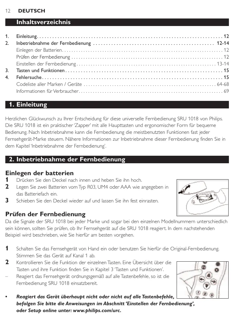 Herzlichen Glückwunsch zu Ihrer Entscheidung für diese universelle Fernbedienung SRU 1018 von Philips. Die SRU 1018 ist ein praktischer ‘Zapper’ mit alle Haupttasten und ergonomischer Form für bequeme Bedienung. Nach Inbetriebnahme kann die Fernbedienung die meistbenutzten Funktionen fast jeder Fernsehgerät-Marke steuern. Nähere Informationen zur Inbetriebnahme dieser Fernbedienung finden Sie in dem Kapitel ‘Inbetriebnahme der Fernbedienung’.