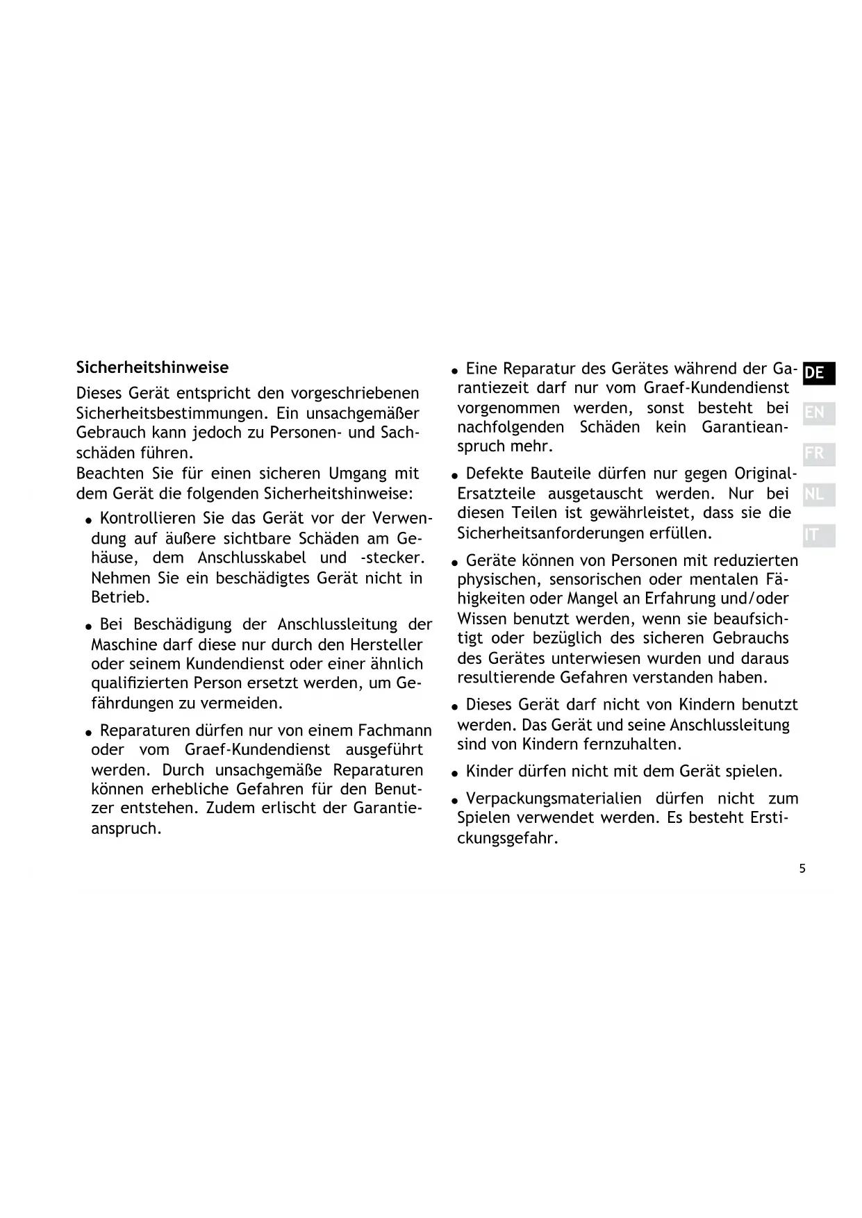 Sicherheitshinweise Dieses Gerät entspricht den vorgeschriebenen Sicherheitsbestimmungen. Ein unsachgemäßer Gebrauch kann jedoch zu Personen- und Sach- schäden führen. Beachten Sie für einen sicheren Umgang mit dem Gerät die folgenden Sicherheitshinweise: Kontrollieren Sie das Gerät vor der Verwen- dung auf äußere sichtbare Schäden am Ge- häuse, dem Anschlusskabel und -stecker. Nehmen Sie ein beschädigtes Gerät nicht in Betrieb. Bei Beschädigung der Anschlussleitung der Maschine darf diese nur durch den Hersteller oder seinem Kundendienst oder einer ähnlich qualizierten Person ersetzt werden, um Ge- fährdungen zu vermeiden. Reparaturen dürfen nur von einem Fachmann oder vom Graef-Kundendienst ausgeführt werden. Durch unsachgemäße Reparaturen können erhebliche Gefahren für den Benut- zer entstehen. Zudem erlischt der Garantie- anspruch. Eine Reparatur des Gerätes während der Ga- rantiezeit darf nur vom Graef-Kundendienst vorgenommen werden, sonst besteht bei nachfolgenden Schäden kein Garantiean- spruch mehr. Defekte Bauteile dürfen nur gegen Original- Ersatzteile ausgetauscht werden. Nur bei diesen Teilen ist gewährleistet, dass sie die Sicherheitsanforderungen erfüllen. Geräte können von Personen mit reduzierten physischen, sensorischen oder mentalen Fä- higkeiten oder Mangel an Erfahrung und/oder Wissen benutzt werden, wenn sie beaufsich- tigt oder bezüglich des sicheren Gebrauchs des Gerätes unterwiesen wurden und daraus resultierende Gefahren verstanden haben. Dieses Gerät darf nicht von Kindern benutzt werden. Das Gerät und seine Anschlussleitung sind von Kindern fernzuhalten. Kinder dürfen nicht mit dem Gerät spielen. Verpackungsmaterialien dürfen nicht zum Spielen verwendet werden. Es besteht Ersti- ckungsgefahr.6 Das Gerät ist bei nicht vorhandener Aufsicht und vor dem Zusammenbau, dem Auseinan- dernehmen oder dem Reinigen stets vom Netz zu trennen. Die Zuleitung immer am Anschlussstecker aus der Steckdose ziehen, nicht am Anschlusska- bel. Vergleichen Sie vor dem Anschließen des Ge- rätes die Anschlussdaten (Spannung und Fre- quenz) auf dem Typenschild mit denen Ihres Elektronetzes. Diese Daten müssen überein- stimmen, damit keine Schäden am Gerät auf- treten. Benutzen Sie das Gerät nicht, wenn das Stromkabel oder der Stecker beschädigt ist. Lassen Sie vor der Weiterbenutzung des Ge- rätes eine neue Anschlussleitung durch den Graef-Kundendienst oder einer autorisierten Fachkraft installieren. Tragen Sie das Gerät nicht am Anschlusskabel. Öffnen Sie auf keinen Fall das Gehäuse des Gerätes. Werden spannungsführende An- schlüsse berührt und der elektrische und me- chanische Aufbau verändert, besteht Strom- schlaggefahr. Niemals unter Spannung stehende Teile berüh- ren. Diese können einen elektrischen Schlag verursachen oder sogar zum Tode führen. Niemals das Gerät während des Betriebes transportieren. Das Gerät nicht mit nassen Händen bedienen. Im Ruhezustand Einstellknopf im Uhrzeiger- sinn über Nullstellung hinaus bis zum An- schlag drehen, so dass die Anschlagplatte die Messerschneide überdeckt. Fassen Sie nicht mit den Fingern an die Schnei- de des Messers. Diese ist sehr scharf und kann schwere Verletzungen verursachen. Das Gerät darf weder ohne Schlitten noch Re- stehalter benutzt werden, es sei denn, Größe und Form des Schneidgutes lassen den Ge- brauch des Restehalters nicht zu. Das Gerät ist nicht dazu bestimmt mit einer externen Zeitschaltuhr oder einer separaten Fernsteuerung verwendet zu werden.7