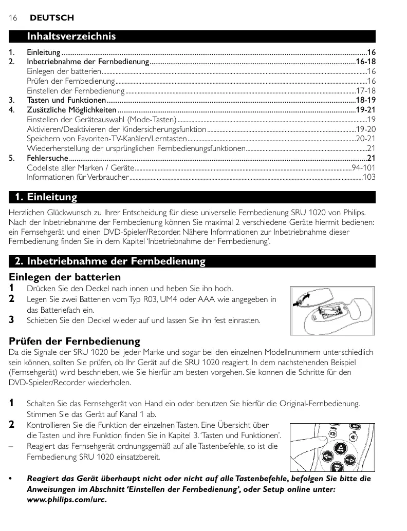 das Batteriefach ein. Schieben Sie den Deckel wieder auf und lassen Sie ihn fest einrasten. Prüfen der Fernbedienung Da die Signale der SRU 1020 bei jeder Marke und sogar bei den einzelnen Modellnummern unterschiedlich sein können, sollten Sie prüfen, ob Ihr Gerät auf die SRU 1020 reagiert. In dem nachstehenden Beispiel (Fernsehgerät) wird beschrieben, wie Sie hierfür am besten vorgehen. Sie konnen die Schritte für den DVD-Spieler/Recorder wiederholen.