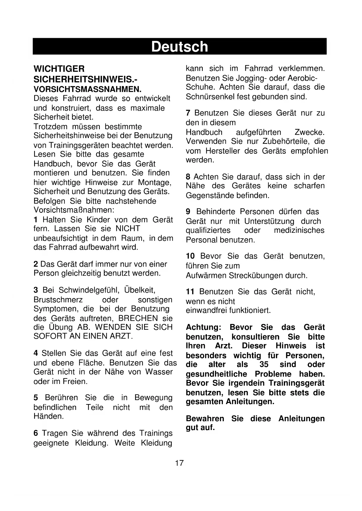 Achtung: Bevor Sie das Gerät benutzen, konsultieren Sie bitte Ihren Arzt. Dieser Hinweis ist besonders wichtig für Personen, die alter als 35 sind oder gesundheitliche Probleme haben. Bevor Sie irgendein Trainingsgerät benutzen, lesen Sie bitte stets die gesamten Anleitungen.