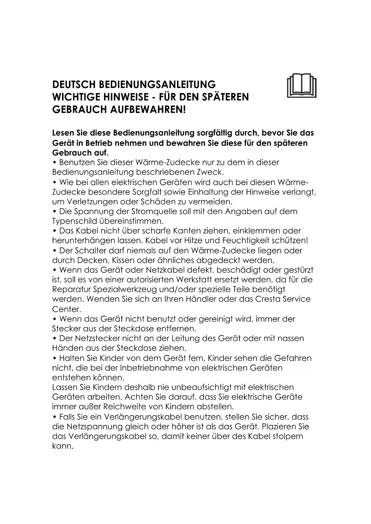 - Benutzen Sie dieser Wärme-Zudecke nur zu dem in dieser Bedienungsanleitung beschriebenen Zweck.