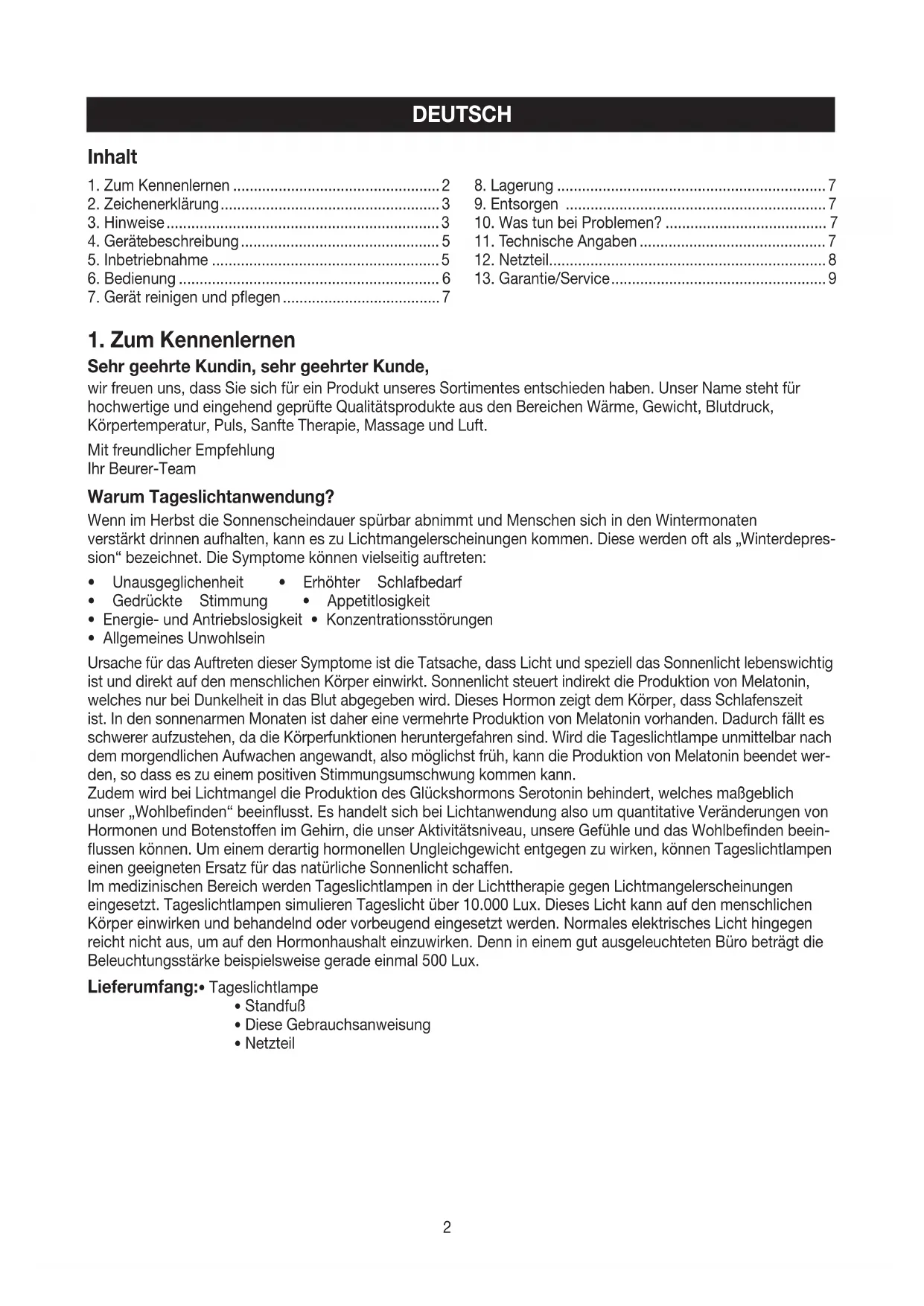 Sehr geehrte Kundin, sehr geehrter Kunde, wir freuen uns, dass Sie sich für ein Produkt unseres Sortimentes entschieden haben. Unser Name steht für hochwertige und eingehend geprüfte Qualitätsprodukte aus den Bereichen Wärme, Gewicht, Blutdruck, Körpertemperatur, Puls, Sanfte Therapie, Massage und Luft. Mit freundlicher Empfehlung Ihr Beurer-Team Warum Tageslichtanwendung? Wenn im Herbst die Sonnenscheindauer spürbar abnimmt und Menschen sich in den Wintermonaten verstärkt drinnen aufhalten, kann es zu Lichtmangelerscheinungen kommen. Diese werden oft als „Winterdepres- sion“ bezeichnet. Die Symptome können vielseitig auftreten: