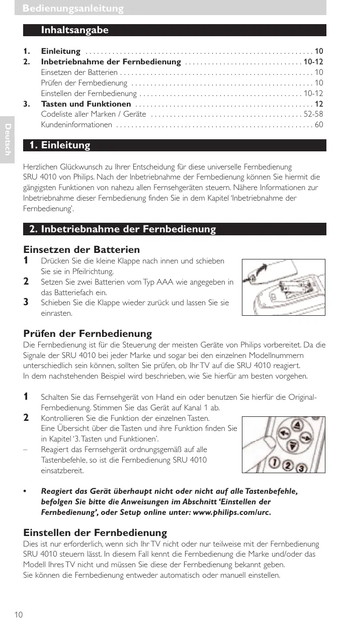 Einleitung . . . . . . . . . . . . . . . . . . . . . . . . . . . . . . . . . . . . . . . . . . . . . . . . . . . . . . . . . . . . 10 Inbetriebnahme der Fernbedienung . . . . . . . . . . . . . . . . . . . . . . . . . . . . . . . 10-12 Einsetzen der Batterien . . . . . . . . . . . . . . . . . . . . . . . . . . . . . . . . . . . . . . . . . . . . . . . . . . . 10 Prüfen der Fernbedienung . . . . . . . . . . . . . . . . . . . . . . . . . . . . . . . . . . . . . . . . . . . . . . . . 10 Einstellen der Fernbedienung . . . . . . . . . . . . . . . . . . . . . . . . . . . . . . . . . . . . . . . . . . . 10-12 Tasten und Funktionen . . . . . . . . . . . . . . . . . . . . . . . . . . . . . . . . . . . . . . . . . . . . . . . 12 Codeliste aller Marken / Geräte . . . . . . . . . . . . . . . . . . . . . . . . . . . . . . . . . . . . . . . . 52-58 Kundeninformationen . . . . . . . . . . . . . . . . . . . . . . . . . . . . . . . . . . . . . . . . . . . . . . . . . . . . 60