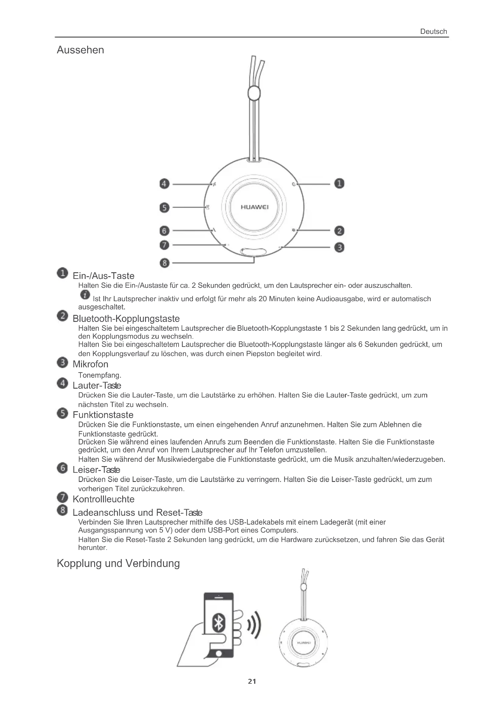Aussehen Ein-/Aus-Taste Halten Sie die Ein-/Austaste für ca. 2 Sekunden gedrückt, um den Lautsprecher ein- oder auszuschalten. Ist Ihr Lautsprecher inaktiv und erfolgt für mehr als 20 Minuten keine Audioausgabe, wird er automatisch ausgeschaltet. Bluetooth-Kopplungstaste Halten Sie bei eingeschaltetem Lautsprecher die Bluetooth-Kopplungstaste 1 bis 2 Sekunden lang gedrückt, um in den Kopplungsmodus zu wechseln. Halten Sie bei eingeschaltetem Lautsprecher die Bluetooth-Kopplungstaste länger als 6 Sekunden gedrückt, um den Kopplungsverlauf zu löschen, was durch einen Piepston begleitet wird. Mikrofon Tonempfang. Lauter-Taste Drücken Sie die Lauter-Taste, um die Lautstärke zu erhöhen. Halten Sie die Lauter-Taste gedrückt, um zum nächsten Titel zu wechseln. Funktionstaste Drücken Sie die Funktionstaste, um einen eingehenden Anruf anzunehmen. Halten Sie zum Ablehnen die Funktionstaste gedrückt. Drücken Sie während eines laufenden Anrufs zum Beenden die Funktionstaste. Halten Sie die Funktionstaste gedrückt, um den Anruf von Ihrem Lautsprecher auf Ihr Telefon umzustellen. Halten Sie während der Musikwiedergabe die Funktionstaste gedrückt, um die Musik anzuhalten/wiederzugeben. Leiser-Taste Drücken Sie die Leiser-Taste, um die Lautstärke zu verringern. Halten Sie die Leiser-Taste gedrückt, um zum vorherigen Titel zurückzukehren. Kontrollleuchte Ladeanschluss und Reset-Taste Verbinden Sie Ihren Lautsprecher mithilfe des USB-Ladekabels mit einem Ladegerät (mit einer Ausgangsspannung von 5 V) oder dem USB-Port eines Computers. Halten Sie die Reset-Taste 2 Sekunden lang gedrückt, um die Hardware zurücksetzen, und fahren Sie das Gerät herunter. Kopplung und VerbindungDeutsch