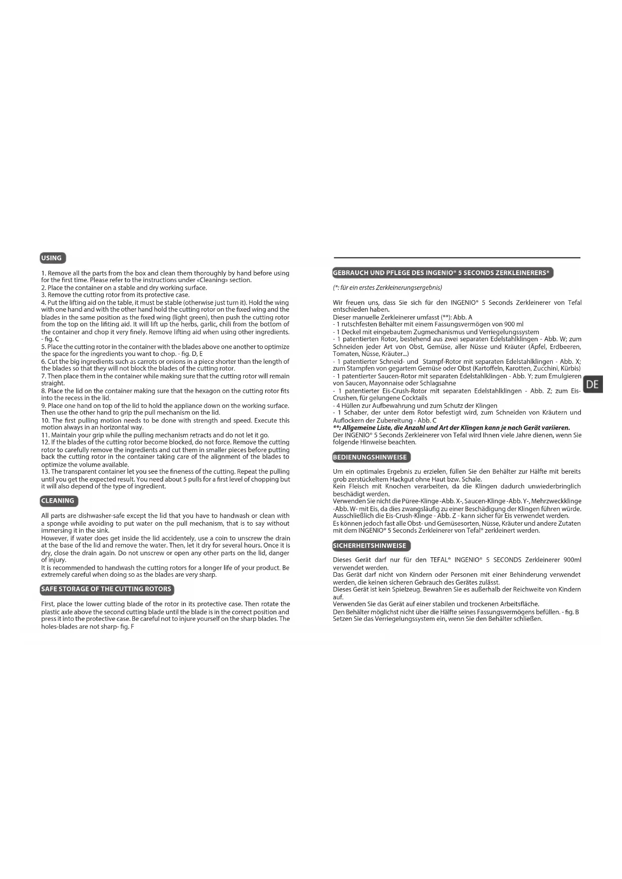 handgreep trekken tot de voeding jn genoeg is. Hou rekening met ongeveer 5 trekbewegingen voor een eerste hakniveau, maar dit hangt ook af van het type van voeding. Reiniging Alle onderdelen mogen in de vaatwasser, met uitzondering van het deksel, dat moet worden afgewassen met de hand of met een spons. Maak het treksnoer niet nat, dus dompel het niet onder in water. Als het toch gebeurt dat er water in het deksel dringt, is dit deksel in de bodem voorzien van een afvoer. U moet deze gewoon losschroeven met een muntstuk en leeggieten. Laat dan enkele uren drogen. Schroef de afvoer er weer op zodra het deksel droog is. Schroef geen andere onderdelen van het deksel los, om verwondingen te voorkomen. Om een langere levensduur van het product te garanderen, wordt aanbevolen om de draaischroef met de hand af te wassen. Let hierbij heel goed op, want de messen zijn vlijmscherp! beVeiligDe oPbeRging Van De DRaaisCHRoeVen Steek het onderste hakmes van de draaischroef in zijn beschermhoes. Laat de plastic as op het tweede hakmes vervolgens draaien tot het mes correct is geplaatst en druk erop om het in de beschermhoes te steken. Let erop u niet te verwonden aan de vlijmscherpe messen. De gaten voor de messen zijn niet scherp - g. F Use & CaRe ingenio® 5 seConDs CHoPPeR* (*: for a rst chopping result) Congratulations on your purchase of the Tefal® INGENIO® 5 seconds chopper. This manual chopper includes (**): g A - 1 anti-slip container with a 900ml capacity - 1 lid with pull mechanism and a locking system - 1 patented cutting rotor composed of two independent stainless steel blades - g.W ; for chopping all your fruits, vegetables, nuts and herbs (apples, strawberries, tomatoes, nuts, herbs, …). - 1 patented cutting and mashing rotor composed of independant stainless steel blades - g X ; for mashing all your cooked vegetables or fruits (potatoes, carrots, courgette,gebRaUCH UnD Pflege Des ingenio® 5 seConDs zeRkleineReRs* (*: für ein erstes Zerkleinerungsergebnis) Wir freuen uns, dass Sie sich für den INGENIO® 5 Seconds Zerkleinerer von Tefal entschieden haben. Dieser manuelle Zerkleinerer umfasst (**): Abb. A - 1 rutschfesten Behälter mit einem Fassungsvermögen von 900 ml - 1 Deckel mit eingebautem Zugmechanismus und Verriegelungssystem - 1 patentierten Rotor, bestehend aus zwei separaten Edelstahlklingen - Abb. W; zum Schneiden jeder Art von Obst, Gemüse, aller Nüsse und Kräuter (Äpfel, Erdbeeren, Tomaten, Nüsse, Kräuter...) - 1 patentierter Schneid- und Stampf-Rotor mit separaten Edelstahlklingen - Abb. X; zum Stampfen von gegartem Gemüse oder Obst (Kartoeln, Karotten, Zucchini, Kürbis) - 1 patentierter Saucen-Rotor mit separaten Edelstahlklingen - Abb. Y; zum Emulgieren von Saucen, Mayonnaise oder Schlagsahne - 1 patentierter Eis-Crush-Rotor mit separaten Edelstahlklingen - Abb. Z; zum Eis- Crushen, für gelungene Cocktails - 4 Hüllen zur Aufbewahrung und zum Schutz der Klingen - 1 Schaber, der unter dem Rotor befestigt wird, zum Schneiden von Kräutern und Auockern der Zubereitung - Abb. C **: Allgemeine Liste, die Anzahl und Art der Klingen kann je nach Gerät variieren. Der INGENIO® 5 Seconds Zerkleinerer von Tefal wird Ihnen viele Jahre dienen, wenn Sie folgende Hinweise beachten. beDienUngsHinweise Um ein optimales Ergebnis zu erzielen, füllen Sie den Behälter zur Hälfte mit bereits grob zerstückeltem Hackgut ohne Haut bzw. Schale. Kein Fleisch mit Knochen verarbeiten, da die Klingen dadurch unwiederbringlich beschädigt werden. Verwenden Sie nicht die Püree-Klinge -Abb. X-, Saucen-Klinge -Abb. Y-, Mehrzweckklinge -Abb. W- mit Eis, da dies zwangsläug zu einer Beschädigung der Klingen führen würde. Ausschließlich die Eis-Crush-Klinge - Abb. Z - kann sicher für Eis verwendet werden. Es können jedoch fast alle Obst- und Gemüsesorten, Nüsse, Kräuter und andere Zutaten mit dem INGENIO® 5 Seconds Zerkleinerer von Tefal® zerkleinert werden. siCHeRHeitsHinweise Dieses Gerät darf nur für den TEFAL® INGENIO® 5 SECONDS Zerkleinerer 900ml verwendet werden. Das Gerät darf nicht von Kindern oder Personen mit einer Behinderung verwendet werden, die keinen sicheren Gebrauch des Gerätes zulässt. Dieses Gerät ist kein Spielzeug. Bewahren Sie es außerhalb der Reichweite von Kindern auf. Verwenden Sie das Gerät auf einer stabilen und trockenen Arbeitsäche. Den Behälter möglichst nicht über die Hälfte seines Fassungsvermögens befüllen. - g. B Setzen Sie das Verriegelungssystem ein, wenn Sie den Behälter schließen. Using