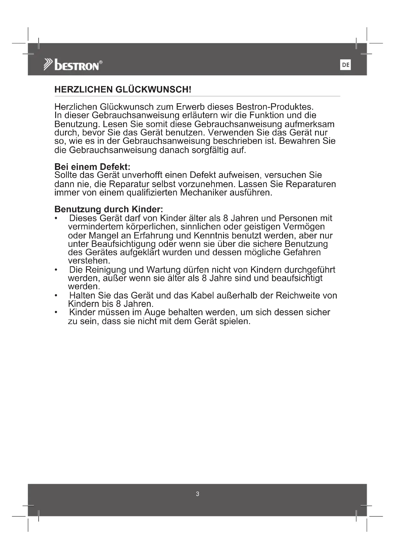 HERZLICHEN GLÜCKWUNSCH! Herzlichen Glückwunsch zum Erwerb dieses Bestron-Produktes. In dieser Gebrauchsanweisung erläutern wir die Funktion und die Benutzung. Lesen Sie somit diese Gebrauchsanweisung aufmerksam durch, bevor Sie das Gerät benutzen. Verwenden Sie das Gerät nur so, wie es in der Gebrauchsanweisung beschrieben ist. Bewahren Sie die Gebrauchsanweisung danach sorgfältig auf. Bei einem Defekt: Sollte das Gerät unverhofft einen Defekt aufweisen, versuchen Sie dann nie, die Reparatur selbst vorzunehmen. Lassen Sie Reparaturen immer von einem qualifizierten Mechaniker ausführen. Benutzung durch Kinder: