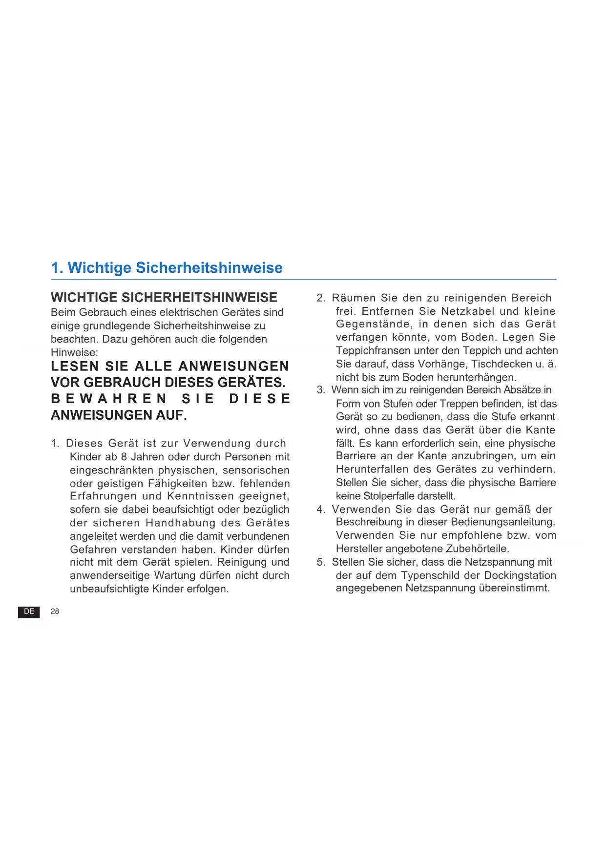 1 Dieses Gerät ist zur Verwendung durch Kinder ab 8 Jahren oder durch Personen mit eingeschränkten physischen, sensorischen oder geistigen Fähigkeiten bzw fehlenden Erfahrungen und Kenntnissen geeignet, sofern sie dabei beaufsichtigt oder bezüglich der sicheren Handhabung des Gerätes angeleitet werden und die damit verbundenen Gefahren verstanden haben Kinder dürfen nicht mit dem Gerät spielen Reinigung und anwenderseitige Wartung dürfen nicht durch unbeaufsichtigte Kinder erfolgen 2 Räumen Sie den zu reinigenden Bereich frei Entfernen Sie Netzkabel und kleine Gegenstände, in denen sich das Gerät verfangen könnte, vom Boden Legen Sie Teppichfransen unter den Teppich und achten Sie darauf, dass Vorhänge, Tischdecken u ä nicht bis zum Boden herunterhängen 3 Wenn sich im zu reinigenden Bereich Absätze in Form von Stufen oder Treppen benden, ist das Gerät so zu bedienen, dass die Stufe erkannt wird, ohne dass das Gerät über die Kante fällt Es kann erforderlich sein, eine physische Barriere an der Kante anzubringen, um ein Herunterfallen des Gerätes zu verhindern Stellen Sie sicher, dass die physische Barriere keine Stolperfalle darstellt 4 Verwenden Sie das Gerät nur gemäß der Beschreibung in dieser Bedienungsanleitung Verwenden Sie nur empfohlene bzw vom Hersteller angebotene Zubehörteile 5 Stellen Sie sicher, dass die Netzspannung mit der auf dem Typenschild der Dockingstation angegebenen Netzspannung übereinstimmt WICHTIGE SICHERHEITSHINWEISE Beim Gebrauch eines elektrischen Gerätes sind einige grundlegende Sicherheitshinweise zu beachten Dazu gehören auch die folgenden Hinweise: