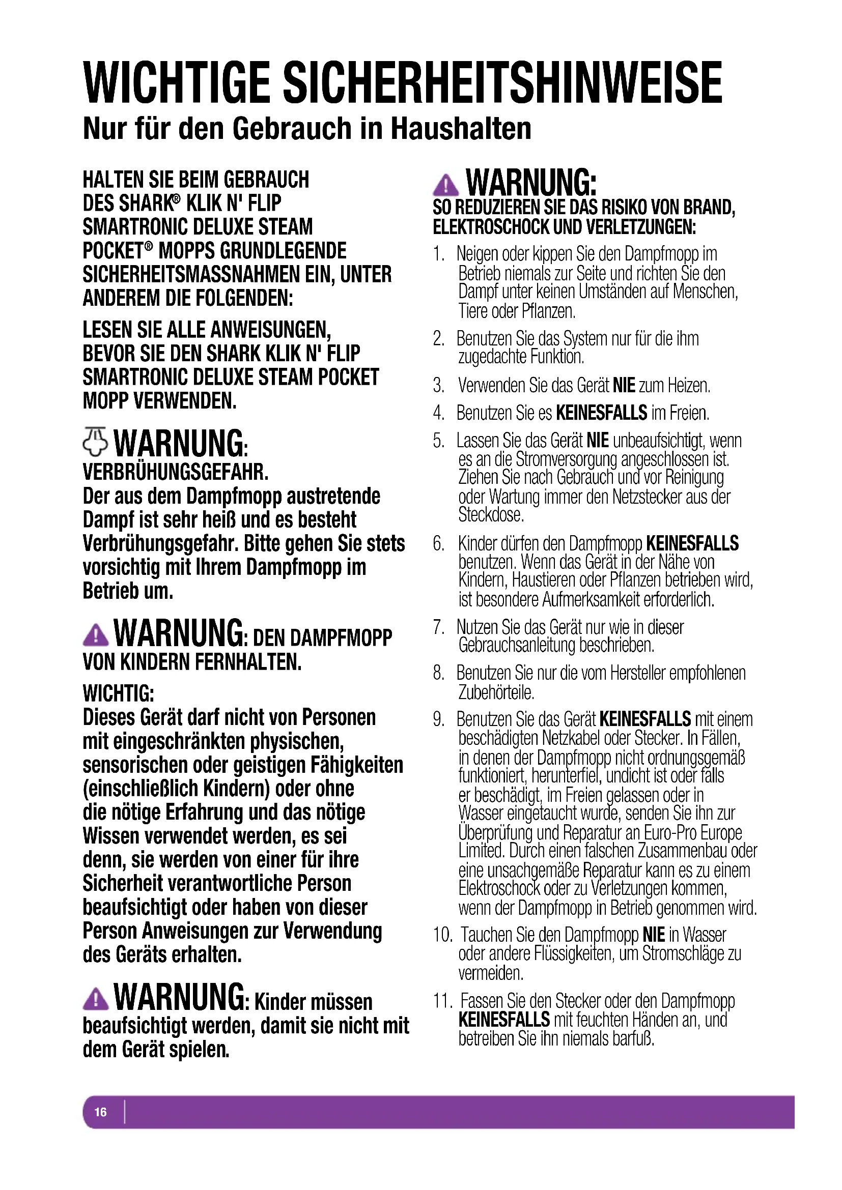- Gebrauch des Dampfmopps zu anderen Zwecken als dem normalen Gebrauch im Haushalt.