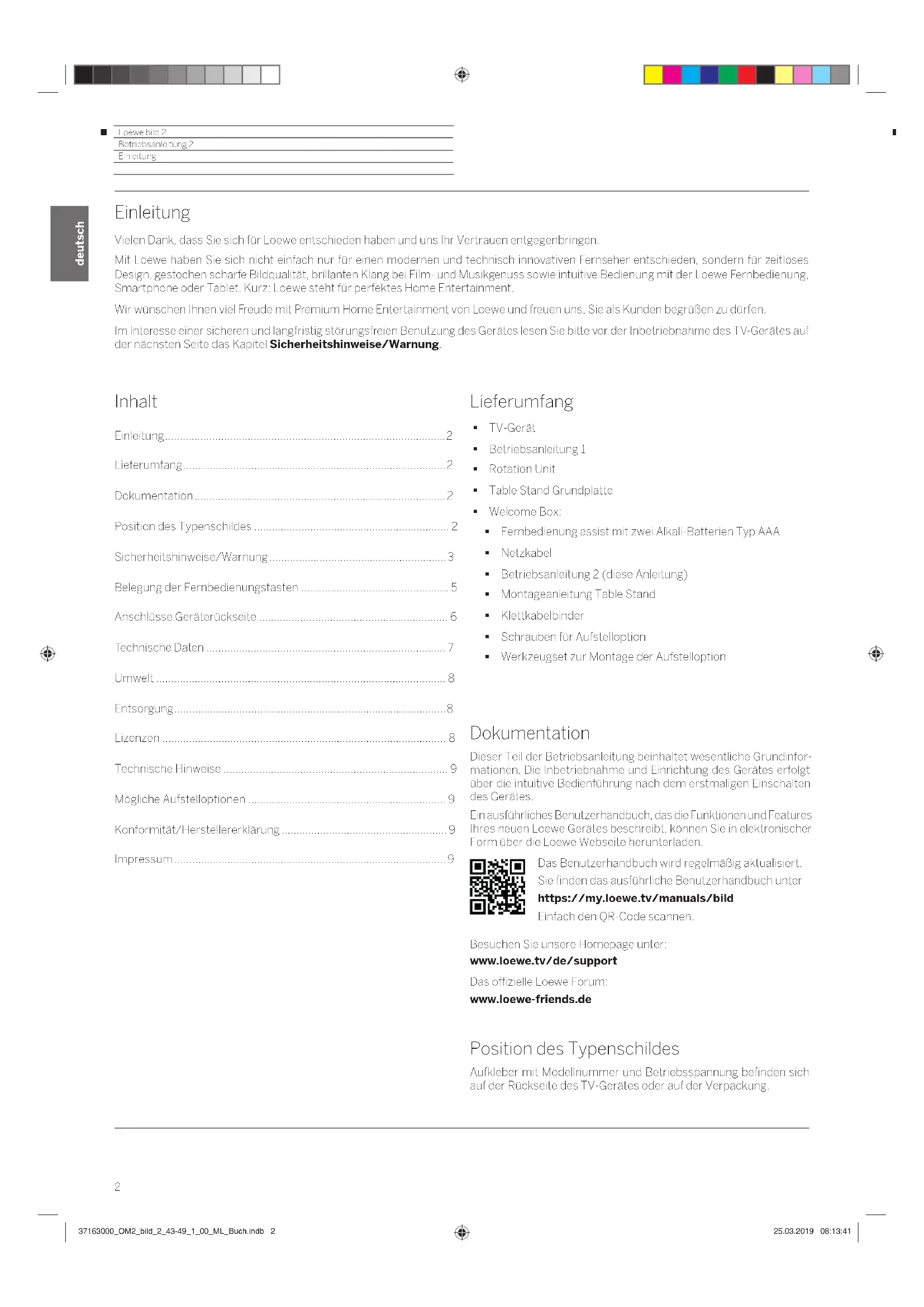 Dokumentation Dieser Teil der Betriebsanleitung beinhaltet wesentliche Grundinfor- mationen. Die Inbetriebnahme und Einrichtung des Gerätes erfolgt über die intuitive Bedienführung nach dem erstmaligen Einschalten des Gerätes. Ein ausführliches Benutzerhandbuch, das die Funktionen und Features Ihres neuen Loewe Gerätes beschreibt, können Sie in elektronischer Form über die Loewe Webseite herunterladen. Das Benutzerhandbuch wird regelmäßig aktualisiert. Sie finden das ausführliche Benutzerhandbuch unter https://my.loewe.tv/manuals/bild Einfach den QR-Code scannen. Besuchen Sie unsere Homepage unter: www.loewe.tv/de/support Das offizielle Loewe Forum: www.loewe-friends.de Position des Typenschildes Aufkleber mit Modellnummer und Betriebsspannung befinden sich auf der Rückseite des TV-Gerätes oder auf der Verpackung. Lieferumfang TV-Gerät Betriebsanleitung 1 Rotation Unit Table Stand Grundplatte Welcome Box: Fernbedienung assist mit zwei Alkali-Batterien Typ AAA Netzkabel Betriebsanleitung 2 (diese Anleitung) Montageanleitung Table Stand Klettkabelbinder Schrauben für Aufstelloption Werkzeugset zur Montage der Aufstelloption 37163000_OM2_bild_2_43-49_1_00_ML_Buch.indb 237163000_OM2_bild_2_43-49_1_00_ML_Buch.indb 2 25.03.2019 08:13:4125.03.2019 08:13:41Loewe bild 2 Betriebsanleitung 2 deutsch