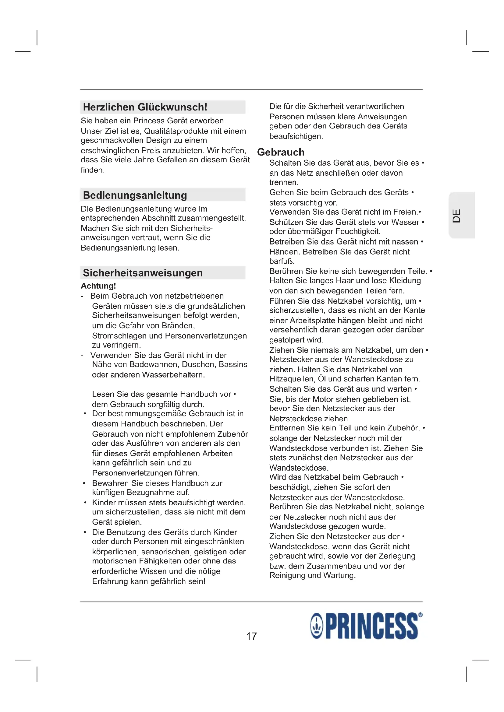 Die für die Sicherheit verantwortlichen Personen müssen klare Anweisungen geben oder den Gebrauch des Geräts beaufsichtigen. Gebrauch Schalten Sie das Gerät aus, bevor Sie es • an das Netz anschließen oder davon trennen. Gehen Sie beim Gebrauch des Geräts • stets vorsichtig vor. Verwenden Sie das Gerät nicht im Freien.• Schützen Sie das Gerät stets vor Wasser • oder übermäßiger Feuchtigkeit. Betreiben Sie das Gerät nicht mit nassen • Händen. Betreiben Sie das Gerät nicht barfuß. Berühren Sie keine sich bewegenden Teile. • Halten Sie langes Haar und lose Kleidung von den sich bewegenden Teilen fern. Führen Sie das Netzkabel vorsichtig, um • sicherzustellen, dass es nicht an der Kante einer Arbeitsplatte hängen bleibt und nicht versehentlich daran gezogen oder darüber gestolpert wird. Ziehen Sie niemals am Netzkabel, um den • Netzstecker aus der Wandsteckdose zu ziehen. Halten Sie das Netzkabel von Hitzequellen, Öl und scharfen Kanten fern. Schalten Sie das Gerät aus und warten • Sie, bis der Motor stehen geblieben ist, bevor Sie den Netzstecker aus der Netzsteckdose ziehen. Entfernen Sie kein Teil und kein Zubehör, • solange der Netzstecker noch mit der Wandsteckdose verbunden ist. Ziehen Sie stets zunächst den Netzstecker aus der Wandsteckdose. Wird das Netzkabel beim Gebrauch • beschädigt, ziehen Sie sofort den Netzstecker aus der Wandsteckdose. Berühren Sie das Netzkabel nicht, solange der Netzstecker noch nicht aus der Wandsteckdose gezogen wurde. Ziehen Sie den Netzstecker aus der • Wandsteckdose, wenn das Gerät nicht gebraucht wird, sowie vor der Zerlegung bzw. dem Zusammenbau und vor der Reinigung und Wartung. Herzlichen Glückwunsch! Sie haben ein Princess Gerät erworben. Unser Ziel ist es, Qualitätsprodukte mit einem geschmackvollen Design zu einem erschwinglichen Preis anzubieten. Wir hoffen, dass Sie viele Jahre Gefallen an diesem Gerät finden. Bedienungsanleitung Die Bedienungsanleitung wurde im entsprechenden Abschnitt zusammengestellt. Machen Sie sich mit den Sicherheits- anweisungen vertraut, wenn Sie die Bedienungsanleitung lesen. Sicherheitsanweisungen Achtung! - Beim Gebrauch von netzbetriebenen Geräten müssen stets die grundsätzlichen Sicherheitsanweisungen befolgt werden, um die Gefahr von Bränden, Stromschlägen und Personenverletzungen zu verringern. - Verwenden Sie das Gerät nicht in der Nähe von Badewannen, Duschen, Bassins oder anderen Wasserbehältern. Lesen Sie das gesamte Handbuch vor • dem Gebrauch sorgfältig durch. Der bestimmungsgemäße Gebrauch ist in • diesem Handbuch beschrieben. Der Gebrauch von nicht empfohlenem Zubehör oder das Ausführen von anderen als den für dieses Gerät empfohlenen Arbeiten kann gefährlich sein und zu Personenverletzungen führen. Bewahren Sie dieses Handbuch zur • künftigen Bezugnahme auf. Kinder müssen stets beaufsichtigt werden, • um sicherzustellen, dass sie nicht mit dem Gerät spielen. Die Benutzung des Geräts durch Kinder • oder durch Personen mit eingeschränkten körperlichen, sensorischen, geistigen oder motorischen Fähigkeiten oder ohne das erforderliche Wissen und die nötige Erfahrung kann gefährlich sein!1818