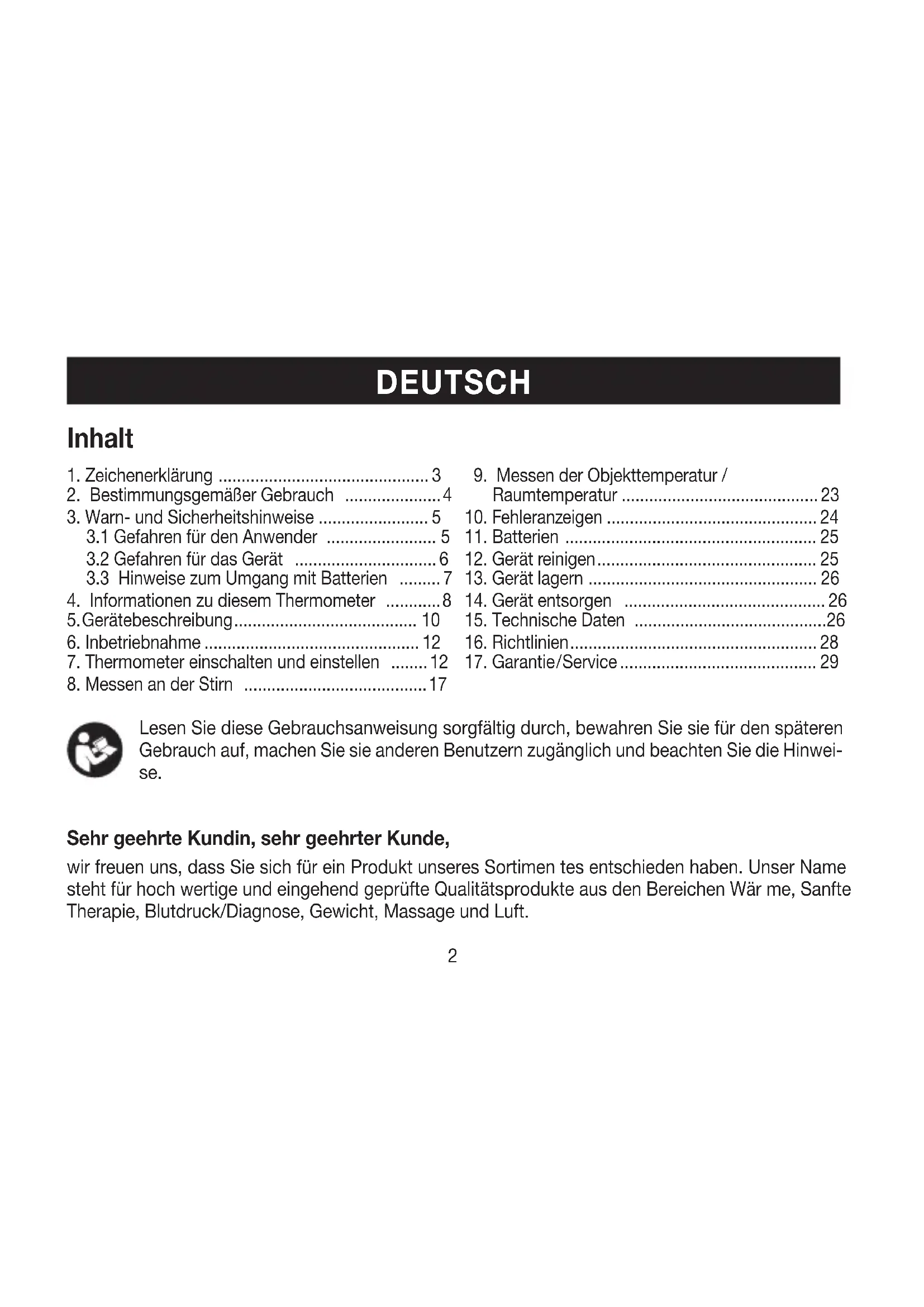 Lesen Sie diese Gebrauchsanweisung sorgfältig durch, bewahren Sie sie für den späteren Gebrauch auf, machen Sie sie anderen Benutzern zugänglich und beachten Sie die Hinwei- se. Sehr geehrte Kundin, sehr geehrter Kunde, wir freuen uns, dass Sie sich für ein Produkt unseres Sortimen tes entschieden haben. Unser Name steht für hoch wertige und eingehend geprüfte Qualitätsprodukte aus den Bereichen Wär me, Sanfte Therapie, Blutdruck/Diagnose, Gewicht, Massage und Luft.3 Bitte lesen Sie diese Gebrauchsanweisung aufmerksam durch, und beachten Sie die Hinweise. Mit freundlicher Empfehlung Ihr Beurer-Team Lieferumfang Überprüfen Sie den Lieferumfang auf äußere Unversehrtheit der Kartonverpackung und auf die Voll- ständigkeit des Inhalts. Vor dem Gebrauch ist sicherzustellen, dass das Gerät und Zubehör keine sichtbaren Schäden aufweisen und jegliches Verpackungsmaterial entfernt wird. Benutzen Sie es im Zweifelsfall nicht und wenden Sie sich an Ihren Händler oder an die angegebene Kundendienstadresse.